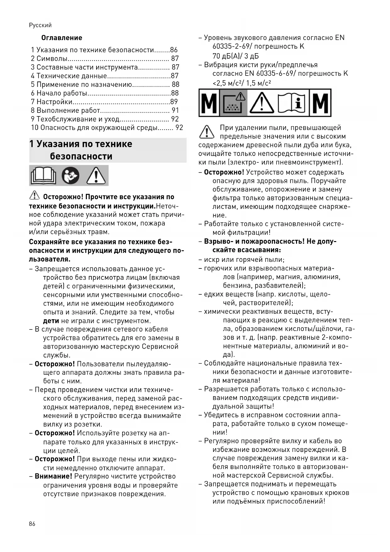 – Осторожно! При выходе пены или жидко сти немедленно отключите аппарат. – Внимание! Регулярно чистите устройство ограничения уровня воды и проверяйте отсутствие признаков повреждения. – Уровень звукового давления согласно EN 60335-2-69/ погрешность K 70 дБ(A)/ 3 дБ – Вибрация кисти руки/предплечья согласно EN 60335-6-69/ погрешность K <2,5 м/с²/ 1,5 м/с² При удалении пыли, превышающей предельные значения или с высоким содержанием древесной пыли дуба или бука, очищайте только непосредственные источни ки пыли (электро- или пневмоинструмент). – Осторожно! Устройство может содержать опасную для здоровья пыль. Поручайте обслуживание, опорожнение и замену фильтра только авторизованным специа листам, имеющим подходящее снаряже