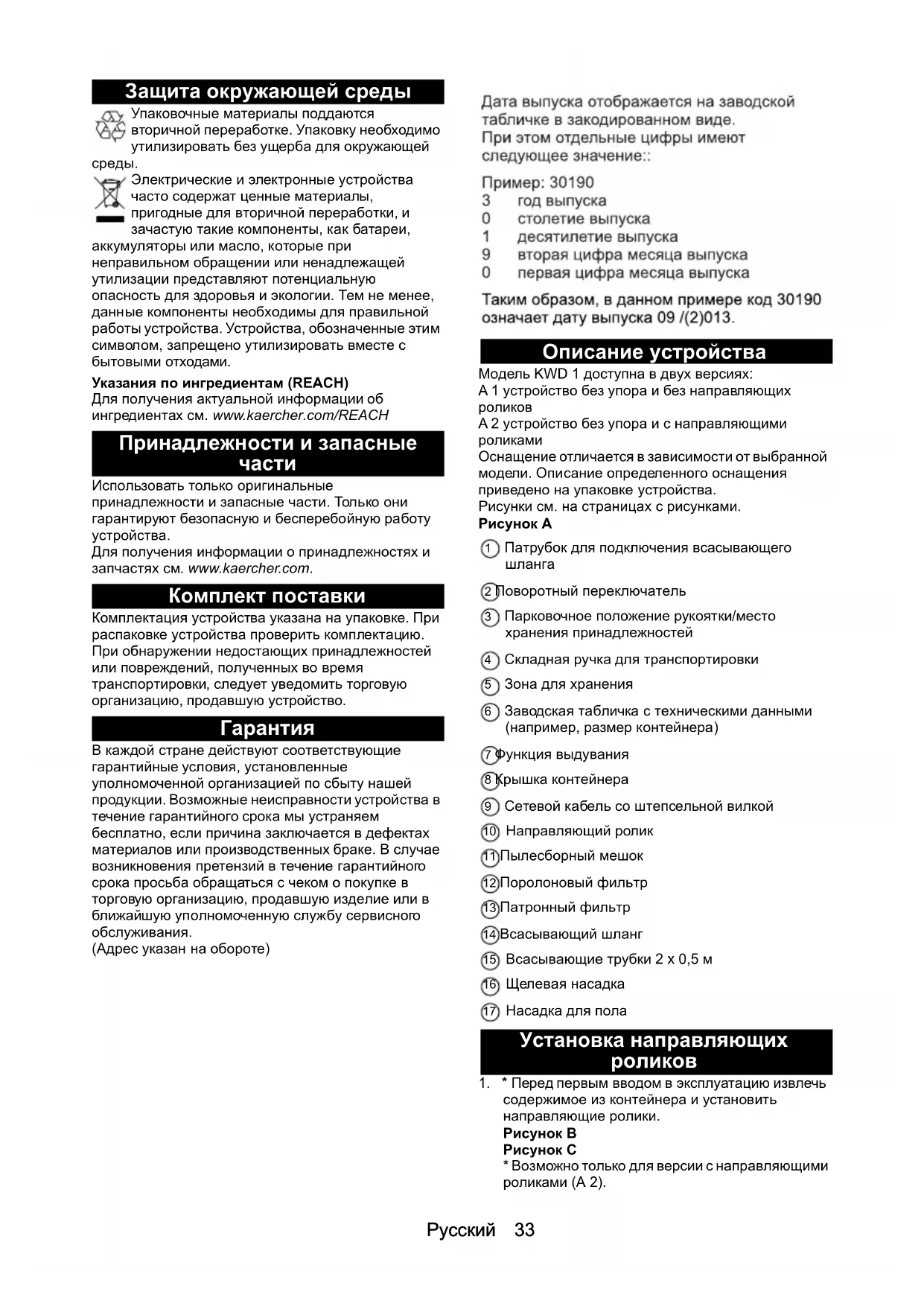 ые компоненты необходимы для правильной работы устройства. Устройства, обозначенные этим символом, запрещено утилизировать вместе с бытовыми отходами. Указания по ингредиентам (REACH) Для получения актуальной информации об ингредиентах см. www.kaercher.com/REACH Принадлежности и запасные