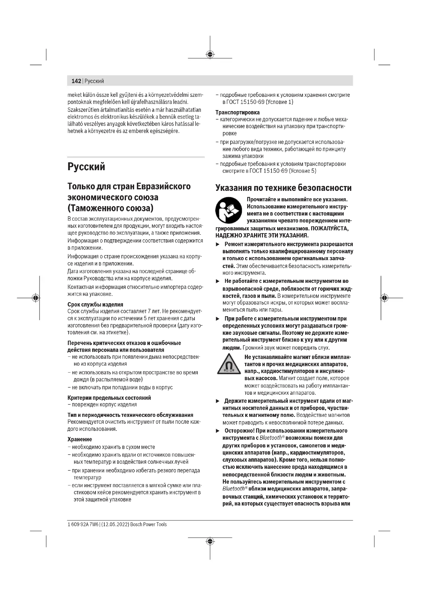– при разгрузке/погрузке не допускается использова- ние любого вида техники, работающей по принципу зажима упаковки – подробные требования к условиям транспортировки смотрите в ГОСТ 15150-69 (Условие 5) Указания по технике безопасности Прочитайте и выполняйте все указания. Использование измерительного инстру- мента не в соответствии с настоящими указаниями чревато повреждением инте- грированных защитных механизмов. ПОЖАЛУЙСТА, НАДЕЖНО ХРАНИТЕ ЭТИ УКАЗАНИЯ. u Ремонт измерительного инструмента разрешается выполнять только квалифицированному персоналу и только с использованием оригинальных запча- стей. Этим обеспечивается безопасность измеритель- ного инструмента. u Не работайте с измерительным инструментом во взрывоопасной среде, поблизости от горючих жид- костей, газов и пыли. В измерительном инструменте могут образоваться искры, от которых может воспла- мениться пыль или пары. u При работе с измерительным инструментом при определенных условиях могут раздаваться гром- кие звуковые сигналы. Поэтому не держите изме- рительный инструмент близко к уху или к другим людям. Громкий звук может повредить слух. Не устанавливайте магнит вблизи имплан- тантов и прочих медицинских аппаратов, напр., кардиостимуляторов и инсулино- вых насосов. Магнит создает поле, которое может воздействовать на работу имплантан- тов и медицинских аппаратов. u Держите измерительный инструмент вдали от маг- нитных носителей данных и от приборов, чувстви- тельных к магнитному полю. Воздействие магнитов может приводить к невосполнимой потере данных. u Осторожно! При использовании измерительного инструмента с Bluetooth® возможны помехи для других приборов и установок, самолетов и меди- цинских аппаратов (напр., кардиостимуляторов, слуховых аппаратов). Кроме того, нельзя полно- стью исключить нанесение вреда находящимся в непосредственной близости людям и животным. Не пользуйтесь измерительным инструментом с Bluetooth® вблизи медицинских аппаратов, запра- вочных станций, химических установок и террито- рий, на которых существует опасность взрыва или 1 609 92A 7M6 | (12.05.2022) Bosch Power ToolsРусский | 143 могут проводиться взрывные работы. Не пользуй- тесь измерительным инструментом с Bluetooth® в самолетах. Старайтесь не включать его на продол- жительное время в непосредственной близости от