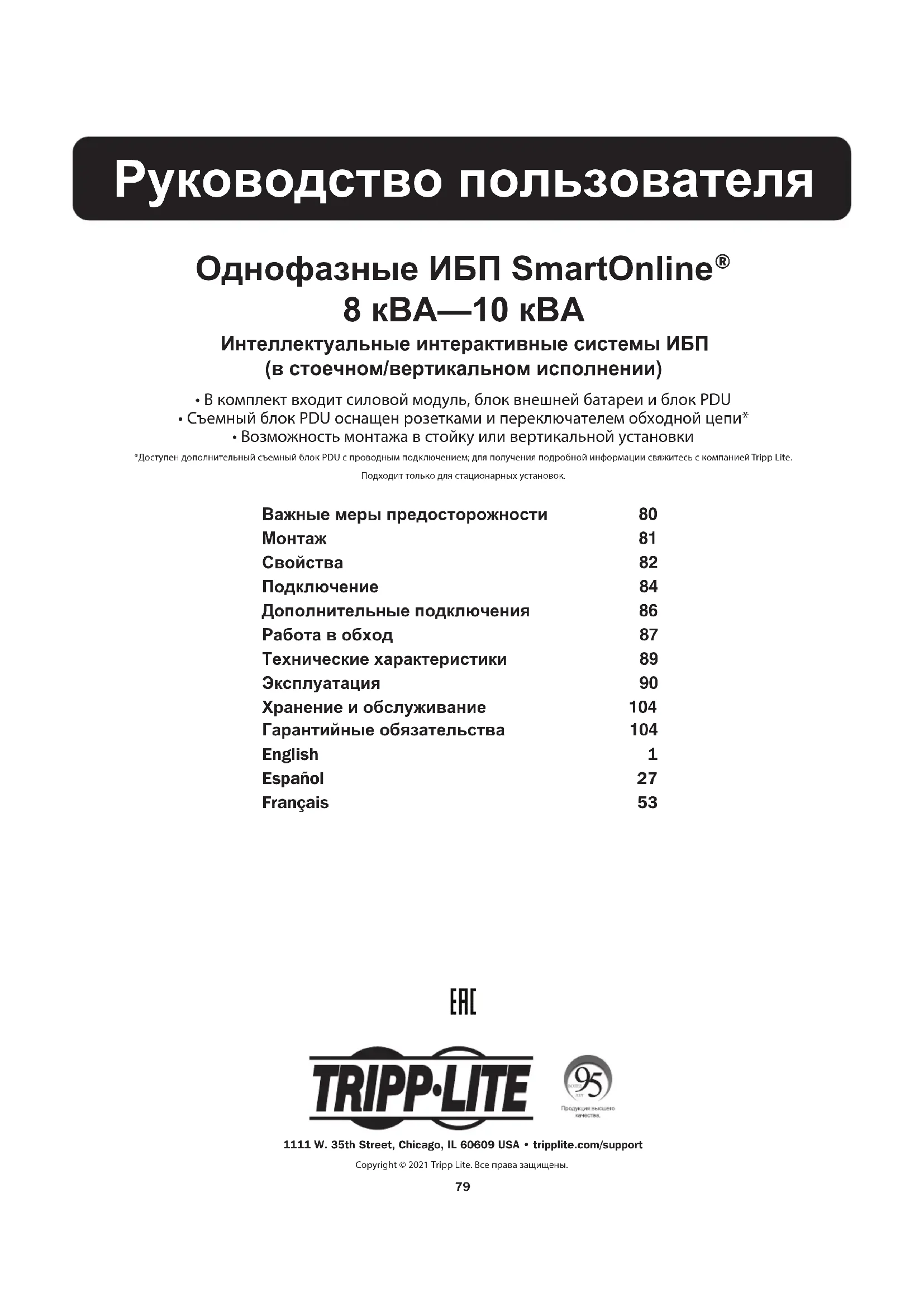 - Возможность монтажа в стойку или вертикальной установки *Доступен дополнительный съемный блок PDU с проводным подключением; для получения подробной информации свяжитесь с компанией Tripp Lite. Подходит только для стационарных установок.1111 W. 35th Street, Chicago, IL 60609 USA • tripplite.com/supportCopyright © 2021 Tripp Lite. Все права защищены. Важные меры предосторожности 80 Монтаж 81 Свойства 82 Подключение 84 Дополнительные подключения 86 Работа в обход 87 Технические характеристики 89 Эксплуатация 90 Хранение и обслуживание 104 Гарантийные обязательства 104 English 1 Español 27 Français 5380 Важные меры предосторожности СОХРАНИТЕ ЭТИ ПРАВИЛА. В данном руководстве содержатся важные инструкции и меры предосторожности, которые следует соблюдать во время установки и обслуживания всех систем ИБП Tripp Lite серии SmartOnline в стоечном/вертикальном исполнении и их батарей. Правила безопасности при выборе места установки ИБП