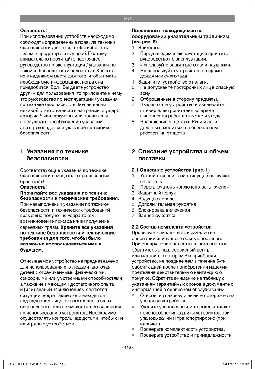 Для выключения отпустите переключатель «включено-выключено» (рис. 7, поз. 2). В комплект поставки входят две щетки: стальная (рис. 2, поз. 8) и нейлоновая (рис. 2, поз. 9). Для нечувствительных поверхностей и трудноудаляемой растительности подходит проволочная щетка. В случае легкой засоренности или на поверхностях, Anl_HFR_E_1410_SPK7.indb 118Anl_HFR_E_1410_SPK7.indb 118 24.09.15 13:3724.09.15 13:37RU