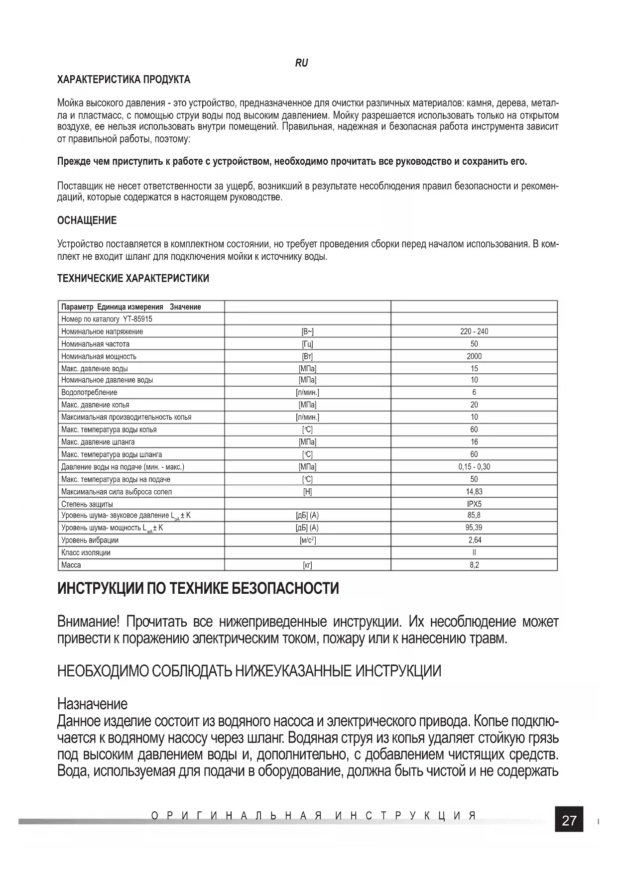 Устройство поставляется в комплектном состоянии, но требует проведения сборки перед началом использования. В ком- плект не входит шланг для подключения мойки к источнику воды. ТЕХНИЧЕСКИЕ ХАРАКТЕРИСТИКИ Параметр Единица измерения Значение Номер по каталогу YT-85915 Номинальное напряжение [В~] 220 - 240 Номинальная частота [Гц]50 Номинальная мощность [Вт] 2000 Макс. давление воды [МПа]15 Номинальное давление воды [МПа]10 Водопотребление [л/мин.] 6 Макс. давление копья [МПа]20 Максимальная производительность копья [л/мин.] 10 Макс. температура воды копья [