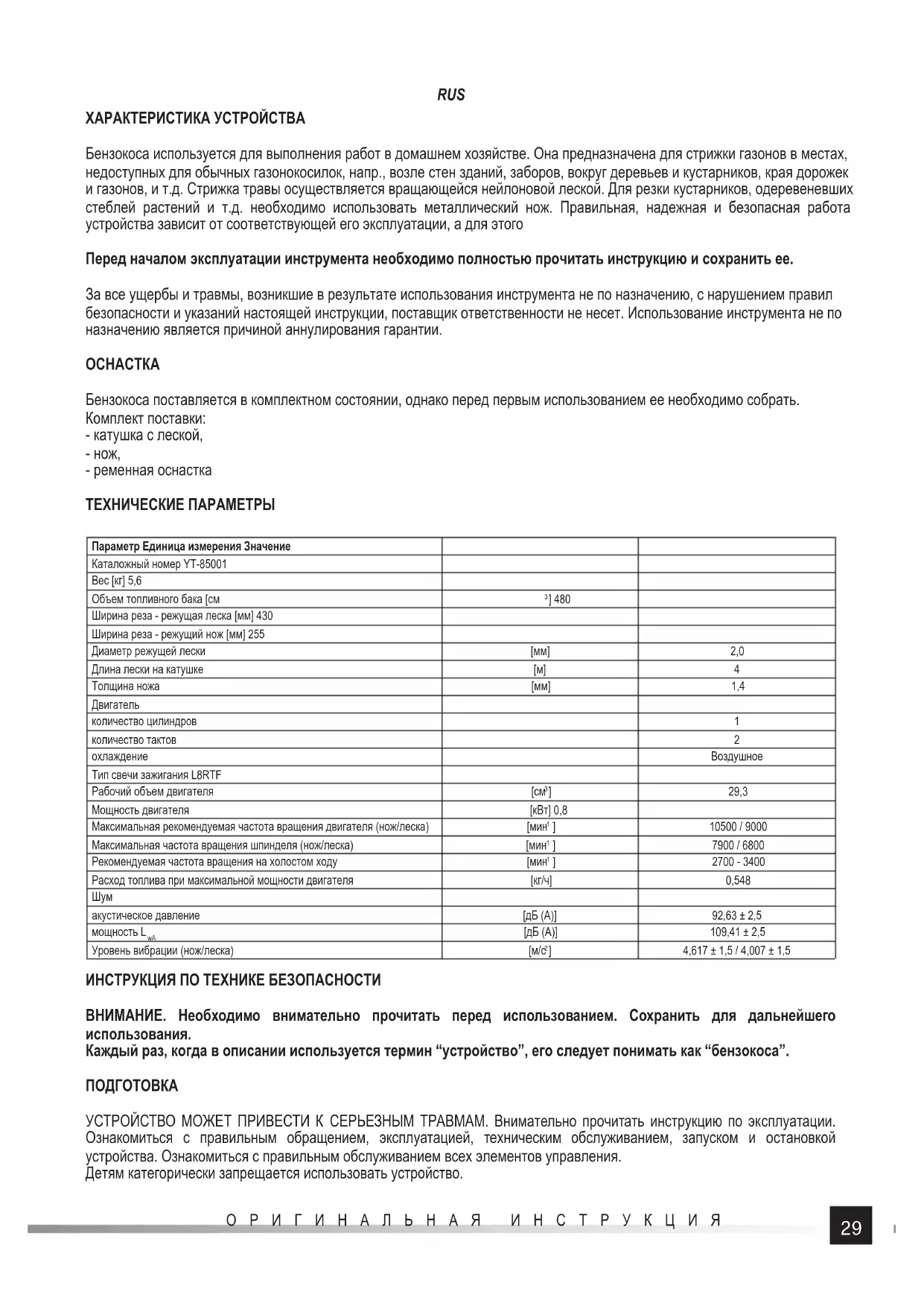 УСТРОЙСТВО МОЖЕТ ПРИВЕСТИ К СЕРЬЕЗНЫМ ТРАВМАМ. Внимательно прочитать инструкцию по эксплуатации. Ознакомиться с правильным обращением, эксплуатацией, техническим обслуживанием, запуском и остановкой устройства. Ознакомиться с правильным обслуживанием всех элементов управления. Детям категорически запрещается использовать устройство.30 ОРИГИНАЛЬНАЯ ИНСТРУКЦИЯ RUS Внимание! Национальное законодательство может ограничивать возможность использования устройства. Во время работы следует быть осторожным с проводами, находящимися под электрическим напряжением. Использовать только принадлежности, предусмотренные производителем: катушку с нейлоновой леской или металлический нож. Запрещается использовать любую другую оснастку, кроме предусмотренной производителем, напр., диски с режущей цепью. Не заменять леску металлической проволокой или бечевкой. Использование другого оборудования, кроме указанного, может привести к серьезной угрозе безопасности оператора и прохожих. Перед установкой режущего элемента и кожуха необходимо убедиться, что они не повреждены, не имеют трещин и не изогнуты. Убедиться, что на металлическом ноже отсутствуют следы ржавчины, а на катушке имеется не менее 1 метра лески. Во время работы существует риск выбрасывания предметов в сторону оператора или прохожих. Оператор несет ответственность за несчастные случаи или угрозу для других людей или окружающей среды. Не работать с устройством, если неподалеку находятся люди, особенно дети. Перед началом работы необходимо установить зону безопасности с радиусом не менее 15 метров от места работы. Всегда использовать средства защиты для глаз и лица, которые защитят глаза, лицо и органы дыхания от пыли, выхлопных газов и предметов, выбрасываемых в процессе работы. Всегда одевать соответствующую, прилегающую к телу защитную одежду. Надевать только длинные брюки. Не надевать свободную одежду и бижутерию, которая может быть затянута движущимися частями устройства. Надевать защитные перчатки и использовать средства защиты органов слуха. Носить защитную обувь с нескользящей подошвой, не работать босиком или в сандалиях. Всегда во время работы следует носить защитный шлем. Необходимо регулярно проводить осмотры в соответствии с информацией, содержащейся в данной инструкции ниже. Это позволит обеспечить более эффективную и безопасную эксплуатацию. Соблюдать предельную осторожность при обращении с топливом. Оно легковоспламеняющееся, а его пары взрывоопасны. Необходимо соблюдать следующие правила. - Использовать канистры, предназначенные для топлива. - Категорически запрещается отвинчивать пробку топливного бака или доливать топливо, если двигатель работает. Перед заправкой требуется подождать, пока двигатель и элементы выхлопной системы остынут. - Не курить. - Категорически запрещается заправлять устройство в помещении. - Категорически запрещается хранить устройство или канистру с топливом в помещениях с открытым источником огня, напр., возле котла. - Не запускать двигатель в месте, где разлилось топливо. Перед запуском устройство необходимо перенести с места разлива топлива. - После заправки обязательно закрыть и сильно затянуть пробку топливного бака. - При необходимости слить топливо, это требуется выполнять вне помещения. Если нож ударит о к