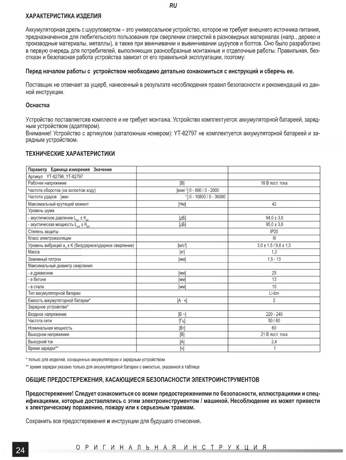 - только для моделей, оснащенных аккумулятором и зарядным устройством ** время зарядки указано только для аккумуляторной батареи с емкостью, указанной в таблице ОБЩИЕ ПРЕДОСТЕРЕЖЕНИЯ, КАСАЮЩИЕСЯ БЕЗОПАСНОСТИ ЭЛЕКТРОИНСТРУМЕНТОВ Предостережение! Следует ознакомиться со всеми предостережениями по безопасности, иллюстрациями и спец- ификациями, которые доставлялись с этим электроинструментом / машиной. Несоблюдение их может привести к электрическому поражению, пожару или к серьезным травмам. Сохранить все предостережения и инструкции для будущего отнесения.25 ОРИГИНАЛЬНАЯ ИНСТРУКЦИЯ