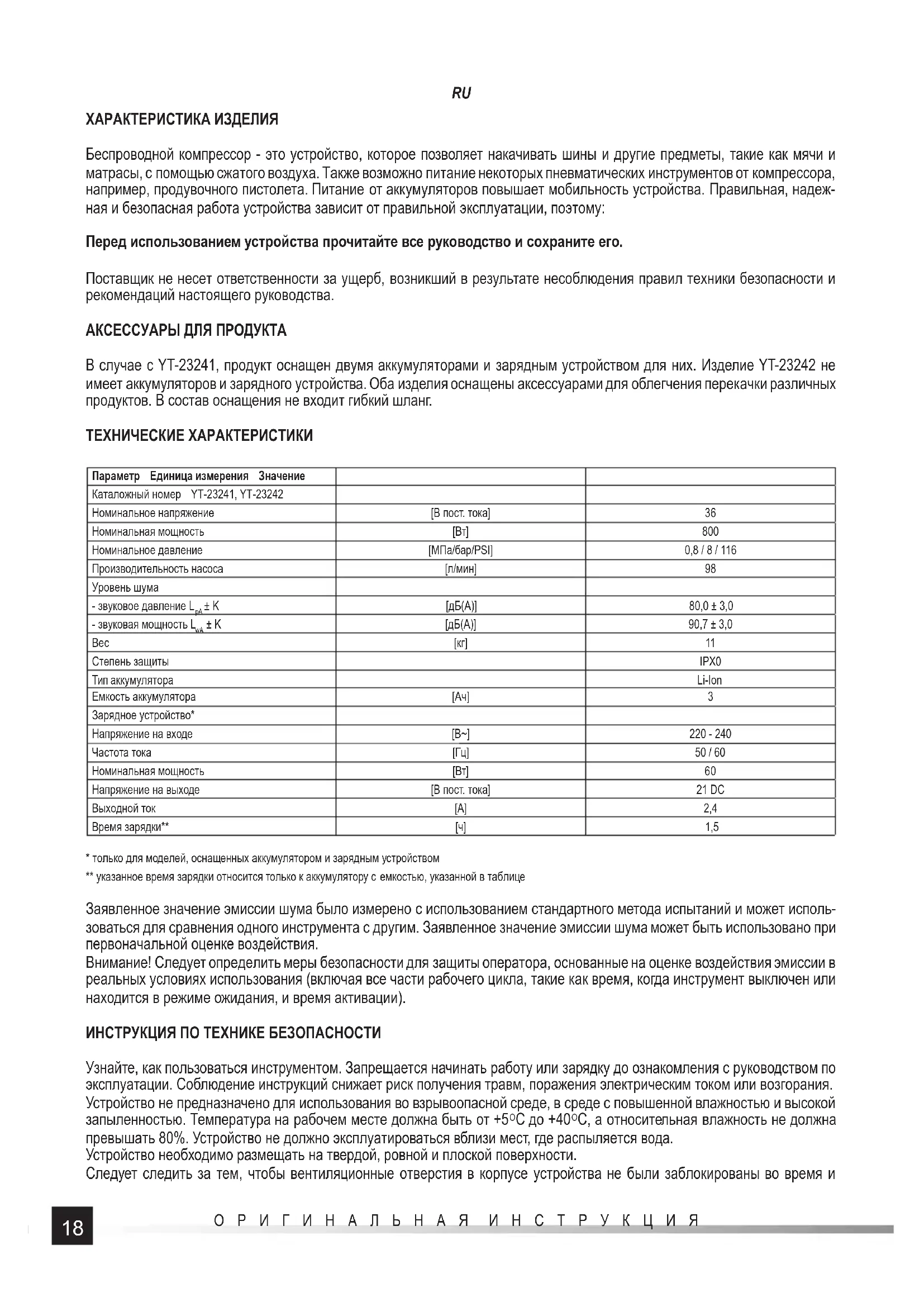 ХАРАКТЕРИСТИКА ИЗДЕЛИЯ Беспроводной компрессор - это устройство, которое позволяет накачивать шины и другие предметы, такие как мячи и матрасы, с помощью сжатого воздуха. Также возможно питание некоторых пневматических инструментов от компрессора, например, продувочного пистолета. Питание от аккумуляторов повышает мобильность устройства. Правильная, надеж- ная и безопасная работа устройства зависит от правильной эксплуатации, поэтому: Перед использованием устройства прочитайте все руководство и сохраните его. Поставщик не несет ответственности за ущерб, возникший в результате несоблюдения правил техники безопасности и рекомендаций настоящего руководства. АКСЕССУАРЫ ДЛЯ ПРОДУКТА В случае с YT-23241, продукт оснащен двумя аккумуляторами и зарядным устройством для них. Изделие YT-23242 не имеет аккумуляторов и зарядного устройства. Оба изделия оснащены аксессуарами для облегчения перекачки различных продуктов. В состав оснащения не входит гибкий шланг. ТЕХНИЧЕСКИЕ ХАРАКТЕРИСТИКИ Параметр Единица измерения Значение Каталожный номер YT-23241, YT-23242 Номинальное напряжение [В пост. тока]36 Номинальная мощность [Вт] 800 Номинальное давление [MПa/бар/PSI] 0,8 / 8 / 116 Производительность насоса [л/мин]98 Уровень шума - звуковое давление L
