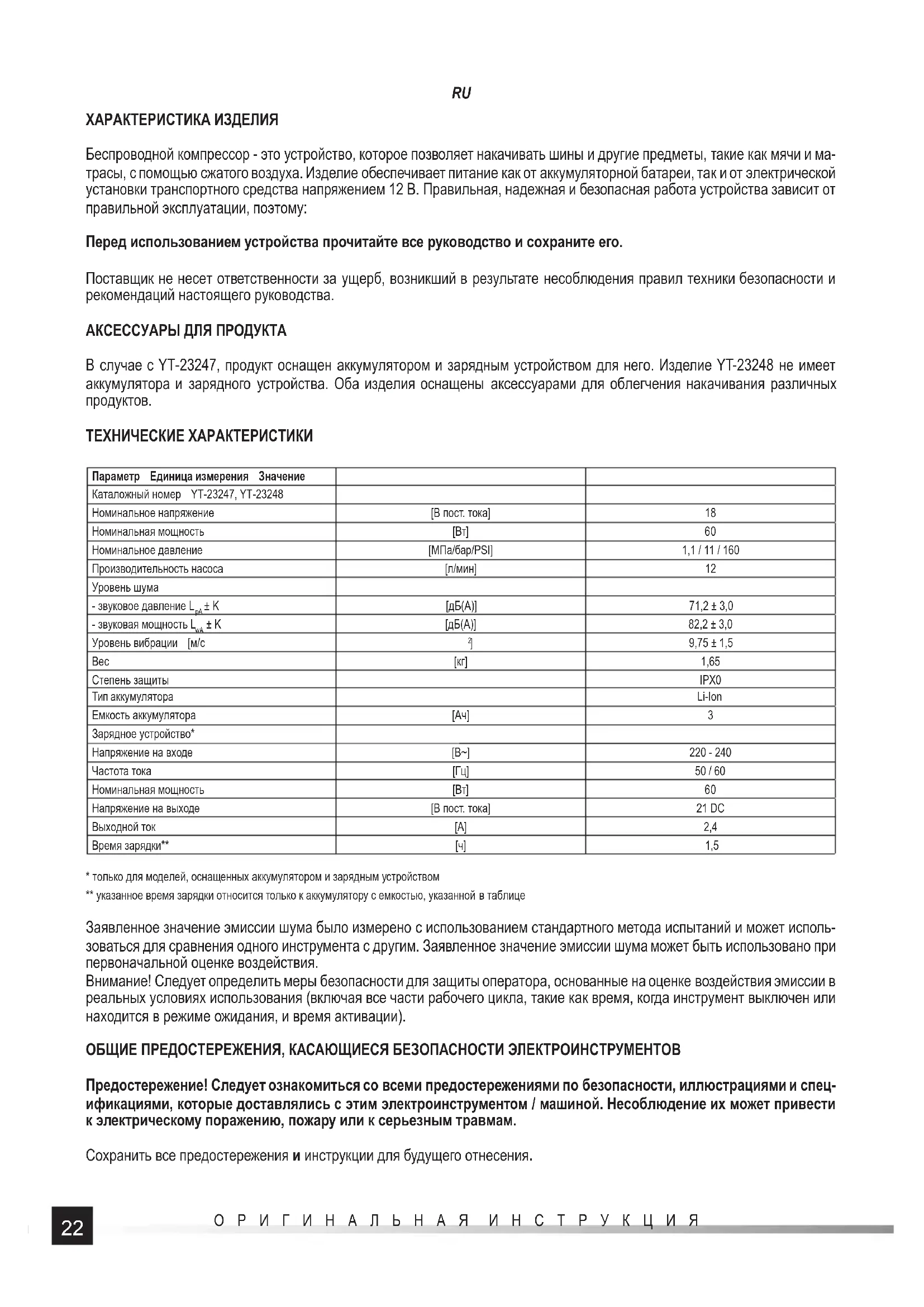 Перед использованием устройства прочитайте все руководство и сохраните его. Поставщик не несет ответственности за ущерб, возникший в результате несоблюдения правил техники безопасности и рекомендаций настоящего руководства. АКСЕССУАРЫ ДЛЯ ПРОДУКТА В случае с YT-23247, продукт оснащен аккумулятором и зарядным устройством для него. Изделие YT-23248 не имеет аккумулятора и зарядного устройства. Оба изделия оснащены аксессуарами для облегчения накачивания различных