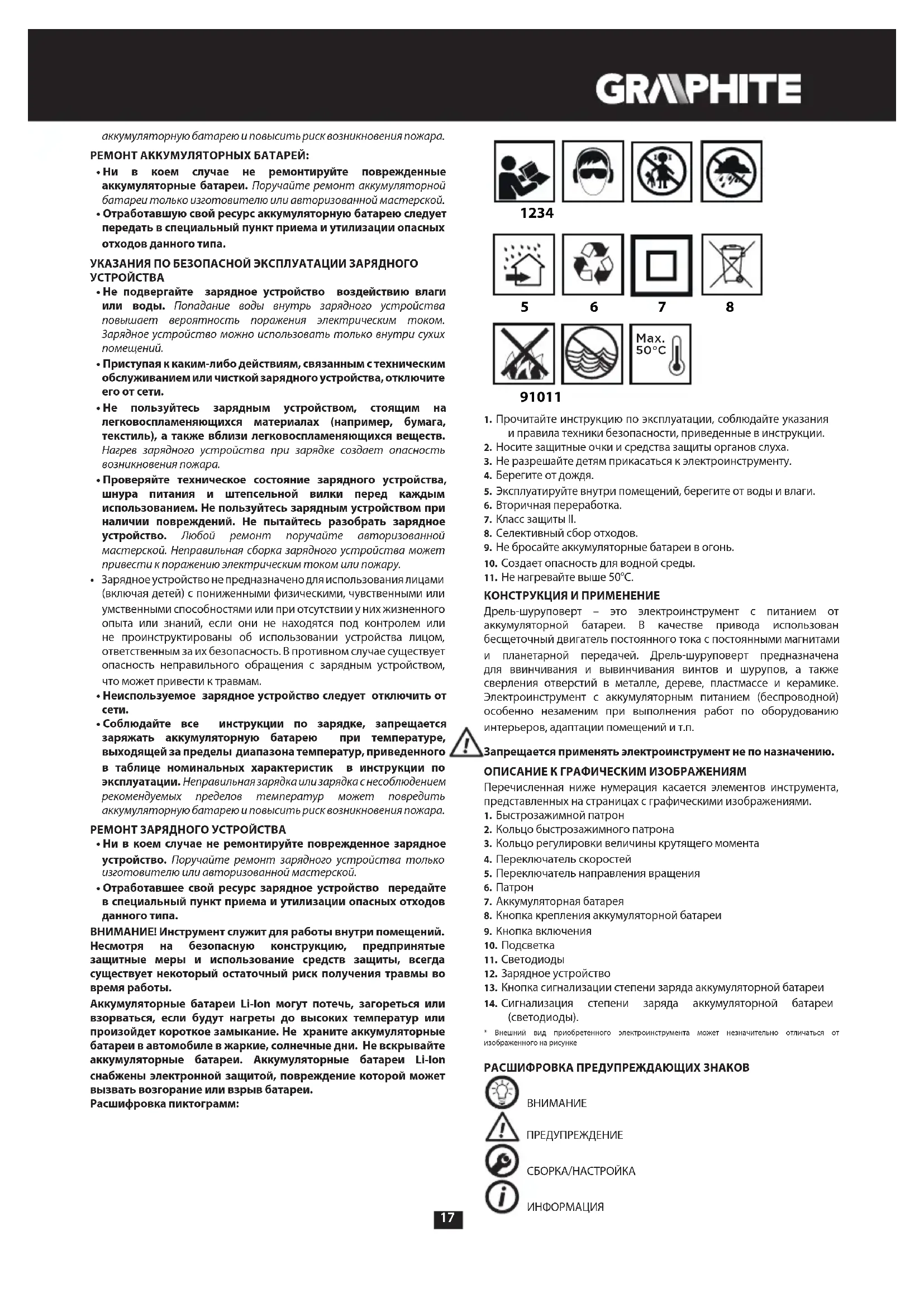 и правила техники безопасности, приведенные в инструкции. 2. Носите защитные очки и средства защиты органов слуха.3. Не разрешайте детям прикасаться к электроинструменту. 4. Берегите от дождя.5. Эксплуатируйте внутри помещений, берегите от воды и влаги.6. Вторичная переработка.7. Класс защиты II. 8. Селективный сбор отходов.9. Не бросайте аккумуляторные батареи в огонь.10. Создает опасность для водной среды.11. Не нагревайте выше 50°C. КОНСТРУКЦИЯ И ПРИМЕНЕНИЕ Дрель-шуруповерт – это электроинструмент с питанием от аккумуляторной батареи. В качестве привода использован бесщеточный двигатель постоянного тока с постоянными магнитами и планетарной передачей. Дрель-шуруповерт предназначена для ввинчивания и вывинчивания винтов и шурупов, а также сверления отверстий в металле, дереве, пластмассе и керамике. Электроинструмент с аккумуляторным питанием (беспроводной) особенно незаменим при выполнения работ по оборудованию интерьеров, адаптации помещений и т.п. Запрещается применять электроинструмент не по назначению. ОПИСАНИЕ К ГРАФИЧЕСКИМ ИЗОБРАЖЕНИЯМ Перечисленная ниже нумерация касается элементов инструмента, представленных на страницах с графическими изображениями. 1. Быстрозажимной патрон2. Кольцо быстрозажимного патрона3. Кольцо регулировки величины крутящего момента4. Переключатель скоростей5. Переключатель направления вращения6. Патрон 7. Аккумуляторная батарея8. Кнопка крепления аккумуляторной батареи9. Кнопка включения10. Подсветка11. Светодиоды12. Зарядное устройство13. Кнопка сигнализации степени заряда аккумуляторной батареи14. Сигнализация степени заряда аккумуляторной батареи (светодиоды).