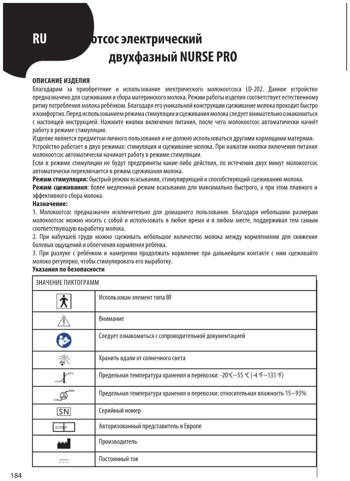 Pentru transmițătoarele cu o putere de ieșire maximă care nu este enumerată mai sus, distanța d de separare recomandată în metri (m) poate estimată utilizând ecuația aplicabilă frecvenței emițătorului, unde P este puterea maximă de ieșire a transmițătorului în wați (W) conform producătorului emițătorului. NOTĂ 1 La 80 MHz și 800 MHz, se aplică distanța de separare pentru intervalul de frecvență mai mare. NOTĂ 2 Este posibil ca aceste instrucțiuni să nu se aplice în toate situațiile. Propagarea electromagnetică este afectată de absorbția și reexia structurilor, obiectelor și oamenilor. Tabelul 4184 RU Молокоотсос электрический двухфазный NURSE PRO ОПИСАНИЕ ИЗДЕЛИЯ Благодарим за приобретение и использование электрического молокоотсоса LD-202. Данное устройство предназначено для сцеживания и сбора материнского молока. Режим работы изделия соответствует естественному ритму потребления молока ребёнком. Благодаря его уникальной конструкции сцеживание молока проходит быстро и комфортно. Перед использованием режима стимуляции и сцеживания молока следует внимательно ознакомиться с настоящей инструкцией. Нажмите кнопки включения питания, после чего молокоотсос автоматически начнёт работу в режиме стимуляции. Изделие является предметом личного пользования и не должно использоваться другими кормящими матерями. Устройство работает в двух режимах: стимуляция и сцеживание молока. При нажатии кнопки включения питания молокоотсос автоматически начинает работу в режиме стимуляции. Если в режиме стимуляции не будут предприняты какие-либо действия, по истечении двух минут молокоотсос автоматически переключается в режим сцеживания молока. Режим стимуляции: быстрый режим всасывания, стимулирующий и способствующий сцеживанию молока. Режим сцеживания: более медленный режим всасывания для максимально быстрого, а при этом плавного и эффективного сбора молока. Назначение:
