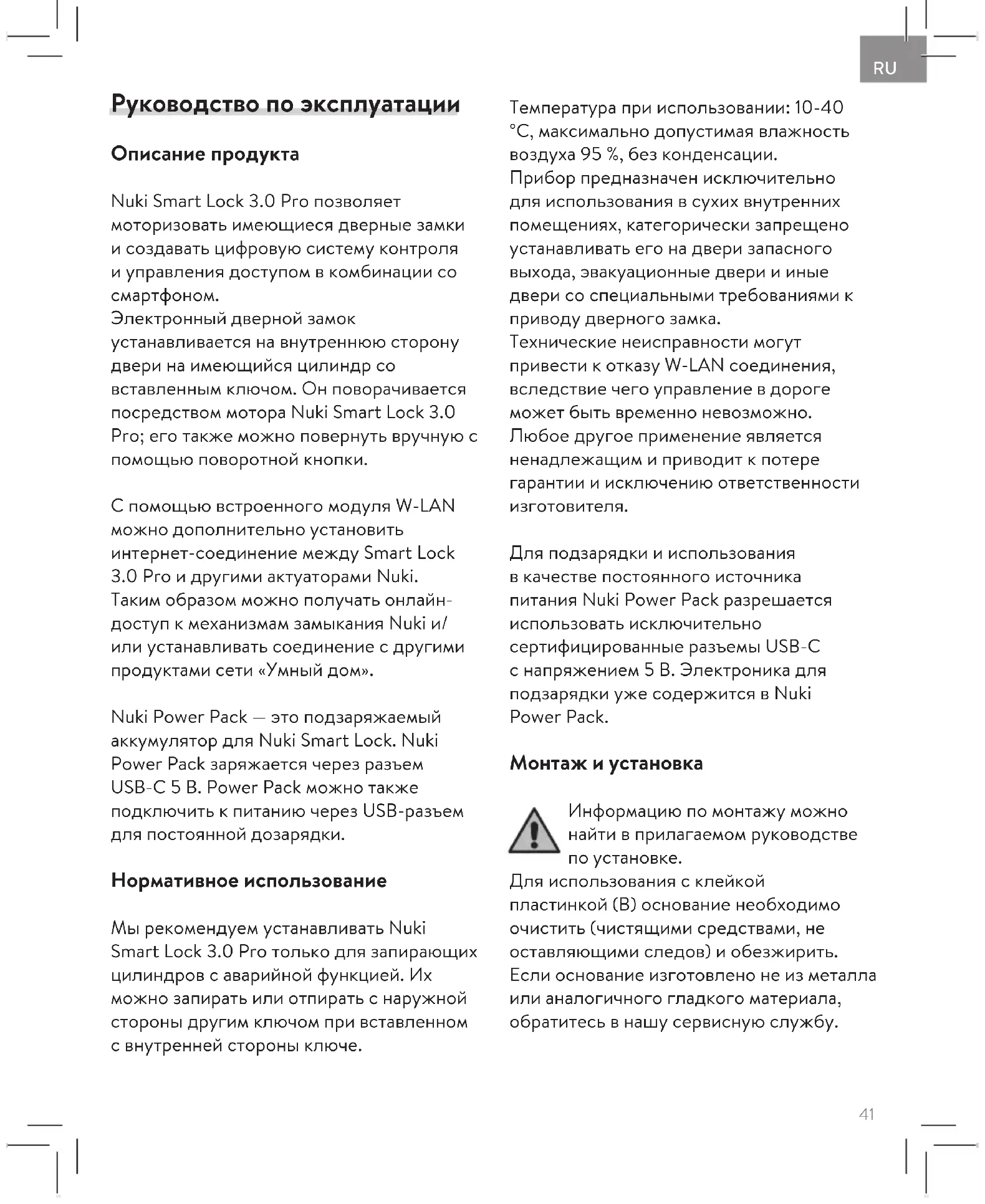 Таким образом можно получать онлайн- доступ к механизмам замыкания Nuki и/ или устанавливать соединение с другими продуктами сети «Умный дом». Nuki Power Pack — это подзаряжаемый аккумулятор для Nuki Smart Lock. Nuki Power Pack заряжается через разъем USB-C 5 В. Power Pack можно также подключить к питанию через USB-разъем для постоянной дозарядки. Нормативное использование Мы рекомендуем устанавливать Nuki Smart Lock 3.0 Pro только для запирающих цилиндров с аварийной функцией. Их можно запирать или отпирать с наружной стороны другим ключом при вставленном с внутренней стороны ключе. Температура при использовании: 10-40 °C, максимально допустимая влажность воздуха 95 %, без конденсации. Прибор предназначен исключительно для использования в сухих внутренних помещениях, категорически запрещено устанавливать его на двери запасного выхода, эвакуационные двери и иные двери со специальными требованиями к приводу дверного замка. Технические неисправности могут привести к отказу W-LAN соединения, вследствие чего управление в дороге может быть временно невозможно. Любое другое применение является ненадлежащим и приводит к потере гарантии и исключению ответственности изготовителя. Для подзарядки и использования в качестве постоянного источника питания Nuki Power Pack разрешается использовать исключительно сертифицированные разъемы USB-C с напряжением 5 В. Электроника для подзарядки уже содержится в Nuki Power Pack. Монтаж и установка Информацию по монтажу можно найти в прилагаемом руководстве по установке. Для использования с клейкой пластинкой (В) основание необходимо очистить (чистящими средствами, не оставляющими следов) и обезжирить. Если основание изготовлено не из металла или аналогичного гладкого материала, обратитесь в нашу сервисную службу. RU42 Руководство по технике безопасности Ниже приведённые правила техники безопасности и указания на потенциальные опасности важны не только для защиты приборы, но и для защиты Вашего здоровья. Внимательно ознакомьтесь с нижеприведёнными
