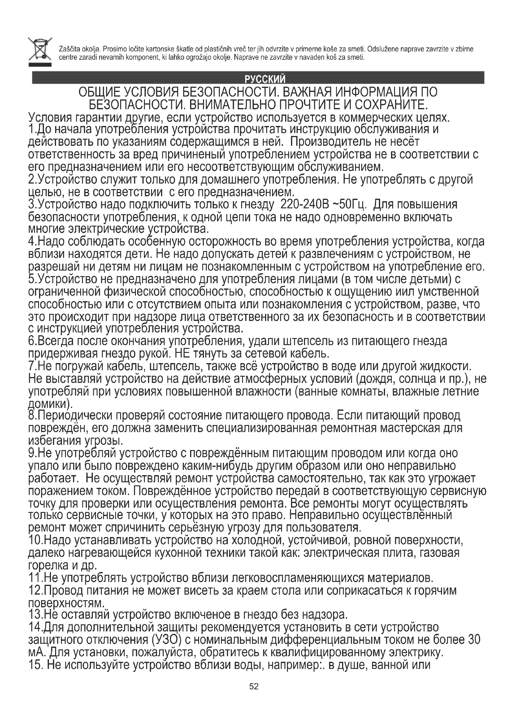 ОБЩИЕ УСЛОВИЯ БЕЗОПАСНОСТИ. ВАЖНАЯ ИНФОРМАЦИЯ ПО БЕЗОПАСНОСТИ. ВНИМАТЕЛЬНО ПРОЧТИТЕ И СОХРАНИТЕ. Условия гарантии другие, если устройство используется в коммерческих целях. 1.До начала употребления устройства прочитать инструкцию обслуживания и действовать по указаниям содержащимся в ней. Производитель не несёт ответственность за вред причиненый употреблением устройства не в соответствии с его предназначением или его несоответствующим обслуживанием. 2.Устройство служит только для домашнего употребления. Не употреблять с другой целью, не в соответствии с его предназначением. 3.Устройство надо подключить только к гнезду 220-240В ~50Гц. Для повышения безопасности употребления, к одной цепи тока не надо одновременно включать многие электрические устройства. 4.Надо соблюдать особенную осторожность во время употребления устройства, когда вблизи находятся дети. Не надо допускать детей к развлечениям с устройством, не разрешай ни детям ни лицам не познакомленным с устройством на употребление его. 5.Устройство не предназначено для употребления лицами (в том числе детьми) с ограниченной физической способностью, способностью к ощущению иил умственной способностью или с отсутствием опыта или познакомления с устройством, разве, что это происходит при надзоре лица ответственного за их безопасность и в соответствии с инструкцией употребления устройства. 6.Всегда после окончания употребления, удали штепсель из питающего гнезда придерживая гнездо рукой. НЕ тянуть за сетевой кабель. 7.Не погружай кабель, штепсель, также всё устройство в воде или другой жидкости. Не выставляй устройство на действие атмосферных условий (дождя, солнца и пр.), не употребляй при условиях повышенной влажности (ванные комнаты, влажные летние