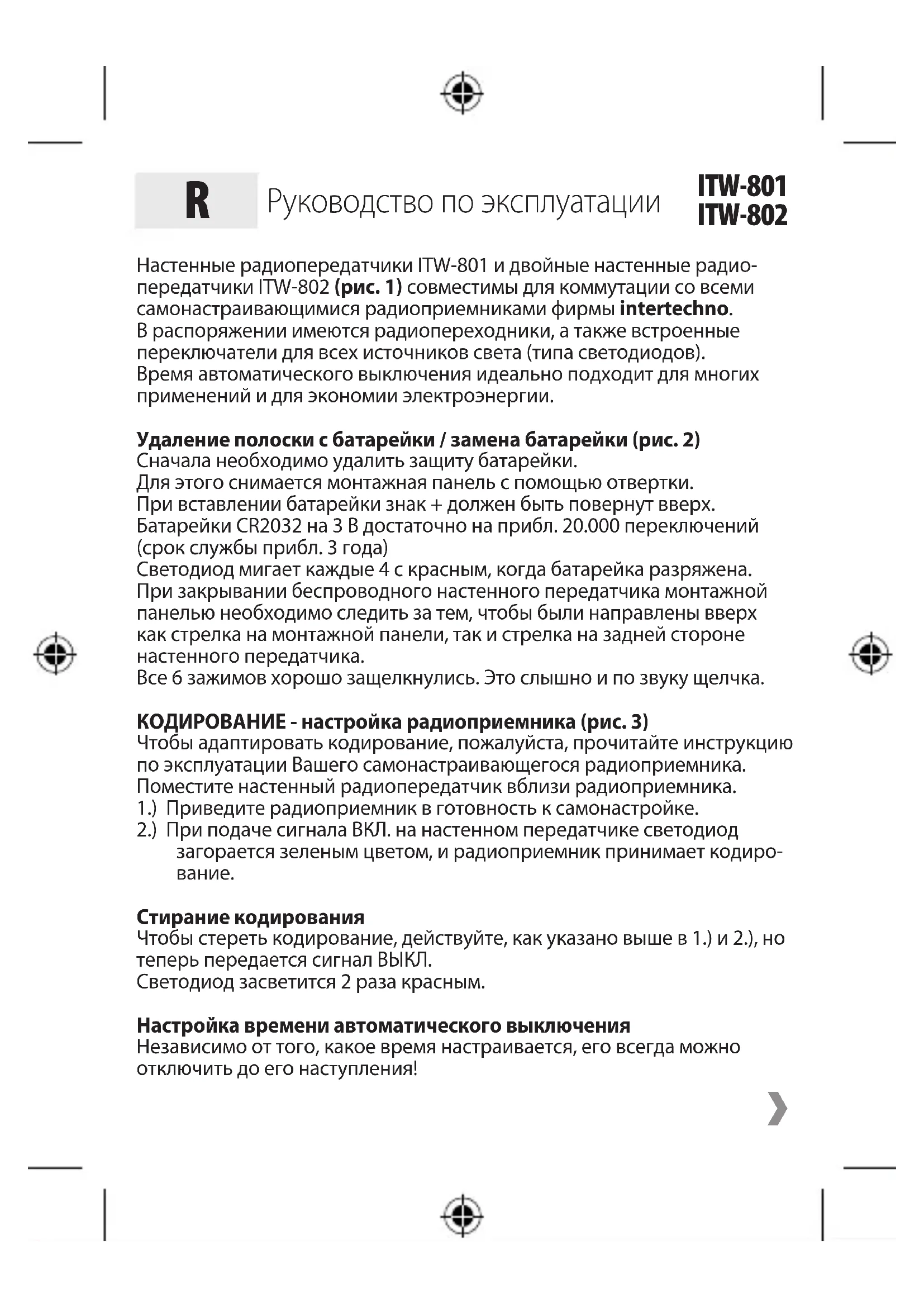 ITW-801 ITW-802Настенные радиопередатчики ITW-801 и двойные настенные радио- передатчики ITW-802 (рис. 1) совместимы для коммутации со всеми самонастраивающимися радиоприемниками фирмы intertechno. В распоряжении имеются радиопереходники, а также встроенные переключатели для всех источников света (типа светодиодов). Время автоматического выключения идеально подходит для многих применений и для экономии электроэнергии. Удаление полоски с батарейки / замена батарейки (рис. 2) Сначала необходимо удалить защиту батарейки. Для этого снимается монтажная панель с помощью отвертки. При вставлении батарейки знак + должен быть повернут вверх. Батарейки CR2032 на 3 В достаточно на прибл. 20.000 переключений (срок службы прибл. 3 года) Светодиод мигает каждые 4 с красным, когда батарейка разряжена. При закрывании беспроводного настенного передатчика монтажной панелью необходимо следить за тем, чтобы были направлены вверх как стрелка на монтажной панели, так и стрелка на задней стороне настенного передатчика. Все 6 зажимов хорошо защелкнулись. Это слышно и по звуку щелчка. КОДИРОВАНИЕ - настройка радиоприемника (рис. 3) Чтобы адаптировать кодирование, пожалуйста, прочитайте инструкцию по эксплуатации Вашего самонастраивающегося радиоприемника. Поместите настенный радиопередатчик вблизи радиоприемника. 1.) Приведите радиоприемник в готовность к самонастройке. 2.) При подаче сигнала ВКЛ. на настенном передатчике светодиод загорается зеленым цветом, и радиоприемник принимает кодиро-