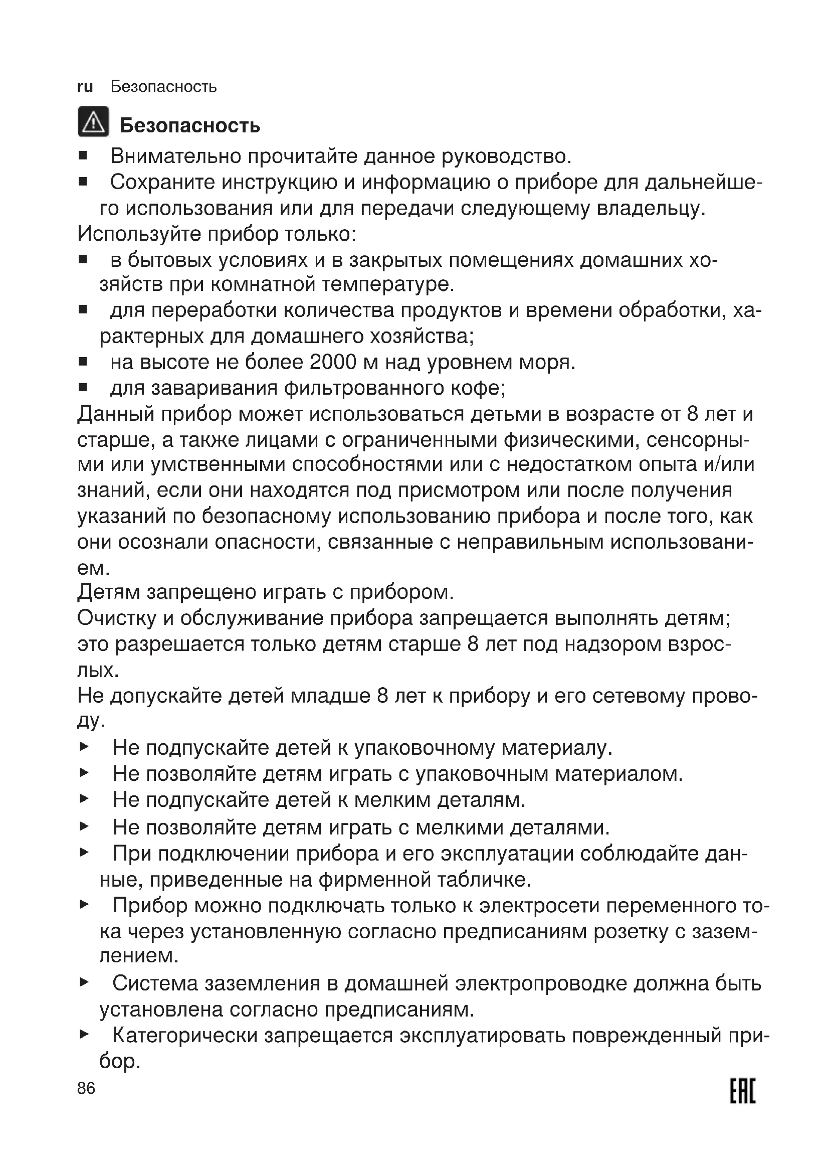 Безопасность ¡ Внимательно прочитайте данное руководство. ¡ Сохраните инструкцию и информацию о приборе для дальнейше- го использования или для передачи следующему владельцу. Используйте прибор только: ¡ в бытовых условиях и в закрытых помещениях домашних хо- зяйств при комнатной температуре. ¡ для переработки количества продуктов и времени обработки, ха- рактерных для домашнего хозяйства; ¡ на высоте не более 2000м над уровнем моря. ¡ для заваривания фильтрованного кофе; Данный прибор может использоваться детьми в возрасте от 8 лет и старше, а также лицами с ограниченными физическими, сенсорны- ми или умственными способностями или с недостатком опыта и/или знаний, если они находятся под присмотром или после получения указаний по безопасному использованию прибора и после того, как они осознали опасности, связанные с неправильным использовани-