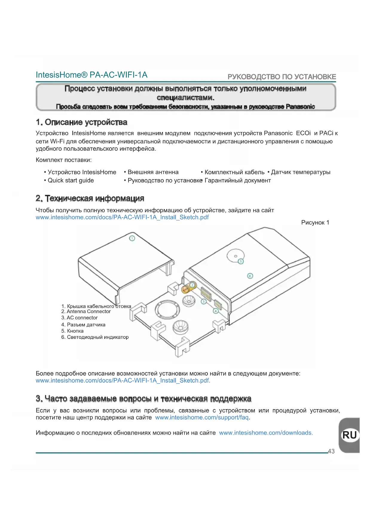 Устройство IntesisHome является внешним модулем подключения устройств Panasonic ECOi и PACi к сети Wi-Fi для обеспечения универсальной подключаемости и дистанционного управления с помощью удобного пользовательского интерфейса. Комплект поставки: Чтобы получить полную техническую информацию об устройстве, зайдите на сайт www.intesishome.com/docs/PA-AC-WIFI-1A_Install_Sketch.pdf Более подробное описание возможностей установки можно найти в следующем документе: www.intesishome.com/docs/PA-AC-WIFI-1A_Install_Sketch.pdf. Если у вас возникли вопросы или проблемы, связанные с устройством или процедурой установки, посетите наш центр поддержки на сайте www.intesishome.com/support/faq. Информацию о последних обновлениях можно найти на сайте www.intesishome.com/downloads. Процесс установки должны выполняться только уполномоченными специалистами. Просьба следовать всем требованиям безопасности, указанным в руководстве Panasonic