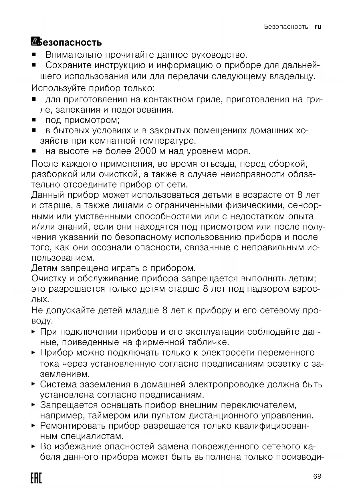 Отпечатано на 100% рециклирана хартия 68 Отпечатано на 100% рециклирана хартияБезопасность ru Безопасность Безопасность ¡ Внимательно прочитайте данное руководство. ¡ Сохраните инструкцию и информацию о приборе для дальней- шего использования или для передачи следующему владельцу. Используйте прибор только: ¡ для приготовления на контактном гриле, приготовления на гри- ле, запекания и подогревания. ¡ под присмотром; ¡ в бытовых условиях и в закрытых помещениях домашних хо- зяйств при комнатной температуре. ¡ на высоте не более 2000м над уровнем моря. После каждого применения, во время отъезда, перед сборкой, разборкой или очисткой, а также в случае неисправности обяза- тельно отсоедините прибор от сети. Данный прибор может использоваться детьми в возрасте от 8 лет и старше, а также лицами с ограниченными физическими, сенсор- ными или умственными способностями или с недостатком опыта и/или знаний, если они находятся под присмотром или после полу- чения указаний по безопасному использованию прибора и после того, как они осознали опасности, связанные с неправильным ис- пользованием. Детям запрещено играть с прибором. Очистку и обслуживание прибора запрещается выполнять детям; это разрешается только детям старше 8 лет под надзором взрос-