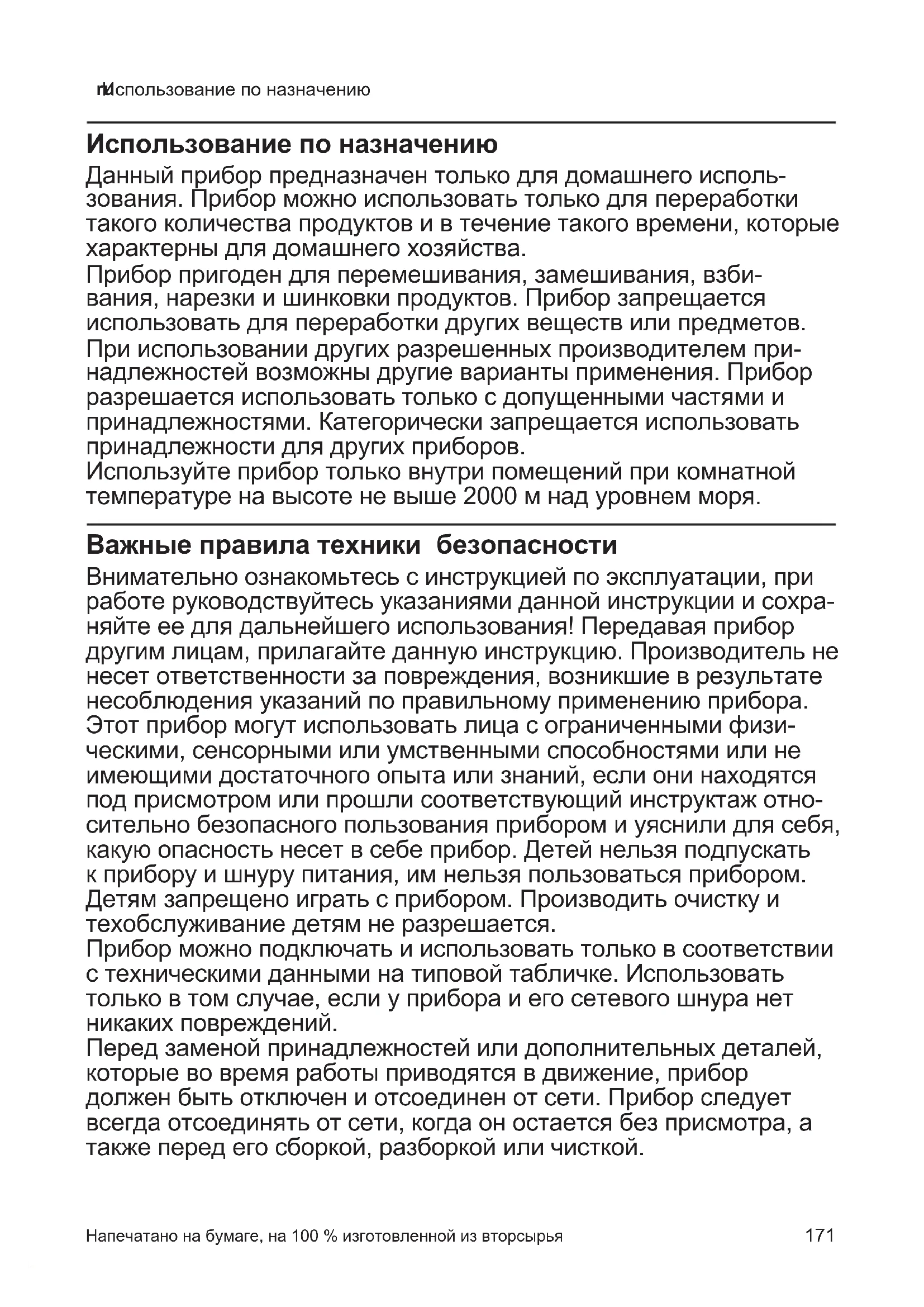 b Месильнаянасадка c Дискдлявзбивания Напечатано на бумаге, на 100 % изготовленной из вторсырья Важныеправилатехникибезопасности174