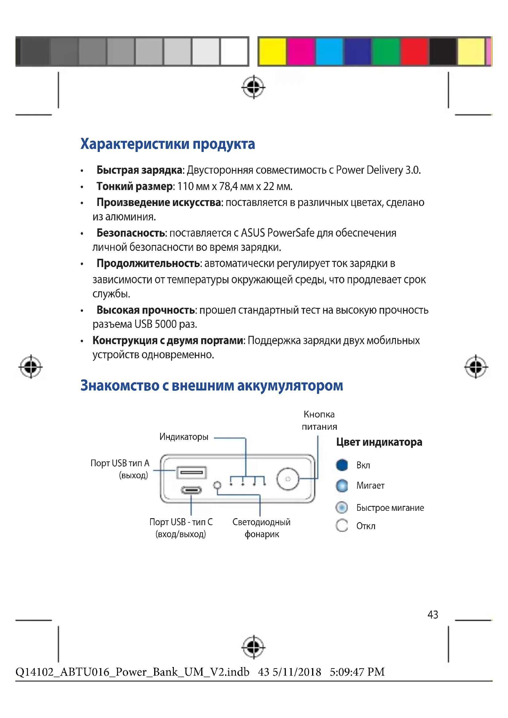 - Длязарядкиустройстванажмитекнопкупитания. Q14102_ABTU016_Power_Bank_UM_V2.indb 44 5/11/2018 5:09:47 PM45 Спецификация
