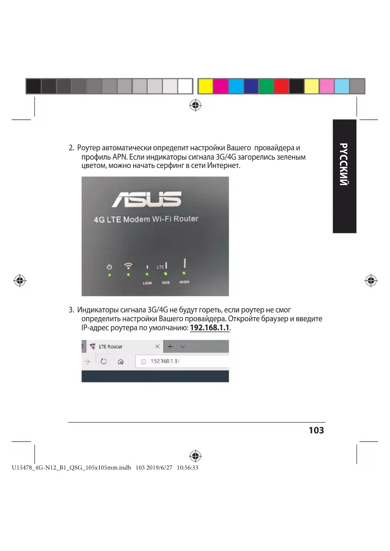 определить настройки Вашего провайдера. Откройте браузер и введите IP-адрес роутера по умолчанию: 192.168.1.1. U15478_4G-N12_B1_QSG_105x105mm.indb 103 2019/6/27 10:56:33PYCCКИЙ