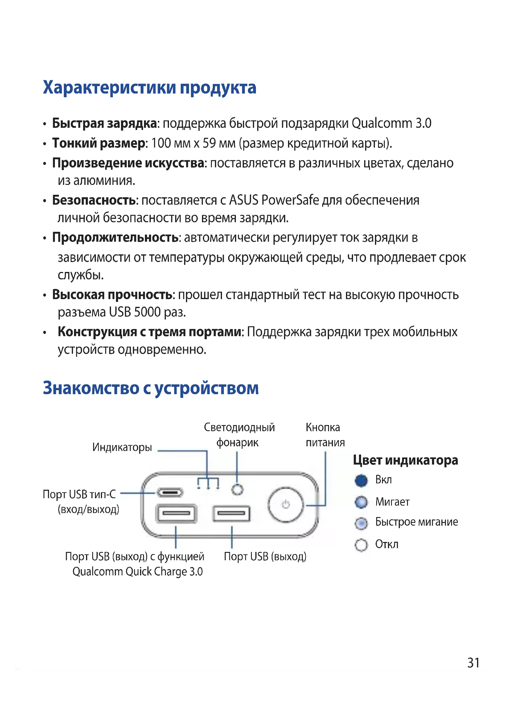 C (140°F) не подвергайте его воздействию воды или огня и не пытайтесь сломать корпус. Служба по утилизации аккумуляторов в Северной Америке Пользователи США и Канады могут получить информацию об утилизации аккумуляторов продукции ASUS по телефону 1-800-822-8837 (звонок бесплатный). Зарядка Power Bank Использование Power Bank35 Caracteristici produs