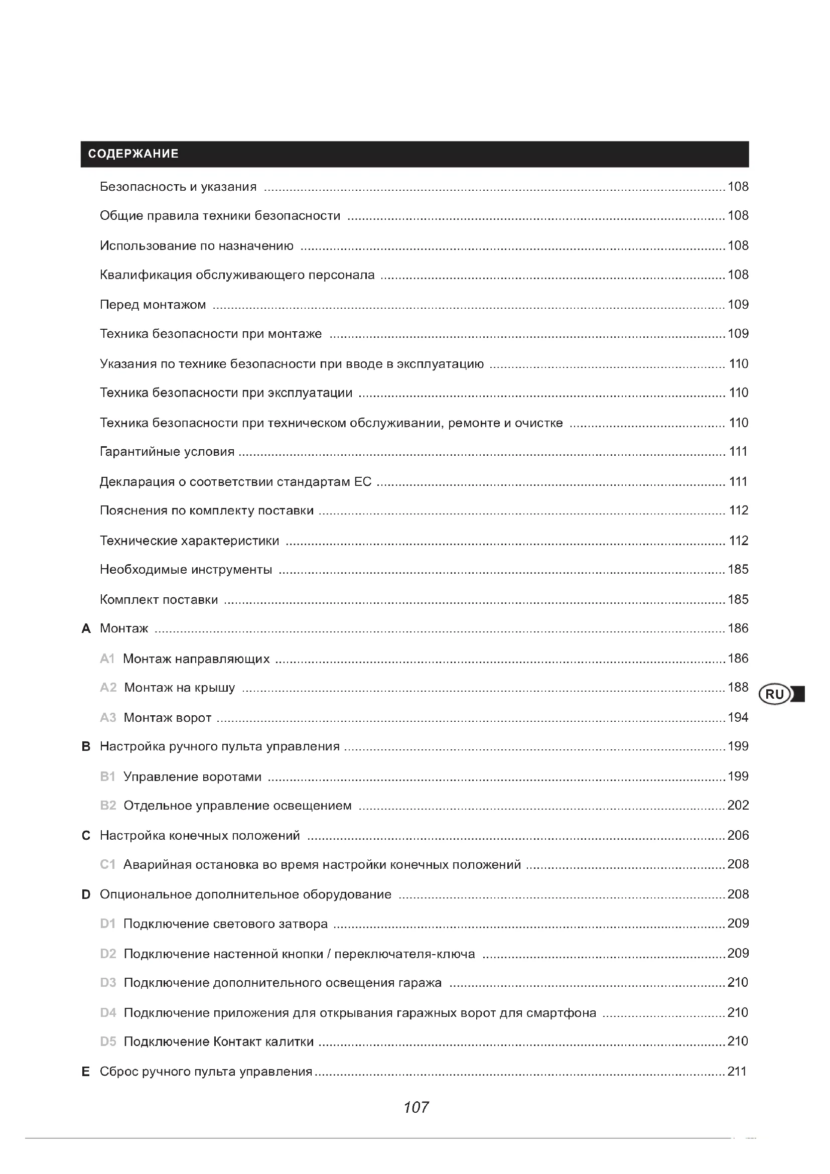 A1 Монтаж направляющих A2 Монтаж на крышу A3 Монтаж ворот Настройка ручного пульта управления B1 Управление воротами B2 Отдельное управление освещением Настройка конечных положений C1 Аварийная остановка во время настройки конечных положений Опциональное дополнительное оборудование D1 Подключение светового затвора D2 Подключение настенной кнопки / переключателя-ключа D3 Подключение дополнительного освещения гаража D4 Подключение приложения для открывания гаражных ворот для смартфона D5 Подключение Контакт калитки Сброс ручного пульта управления