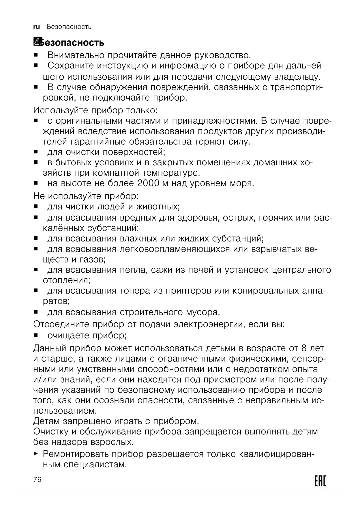 ¡ для всасывания строительного мусора. Отсоедините прибор от подачи электроэнергии, если вы: ¡ очищаете прибор; Данный прибор может использоваться детьми в возрасте от 8 лет и старше, а также лицами с ограниченными физическими, сенсор- ными или умственными способностями или с недостатком опыта и/или знаний, если они находятся под присмотром или после полу- чения указаний по безопасному использованию прибора и после того, как они осознали опасности, связанные с неправильным ис- пользованием. Детям запрещено играть с прибором. Очистку и обслуживание прибора запрещается выполнять детям без надзора взрослых. Ремонтировать прибор разрешается только квалифицирован- ным специалистам. 76Безопасность ru Для ремонта прибора можно использовать только оригинальные