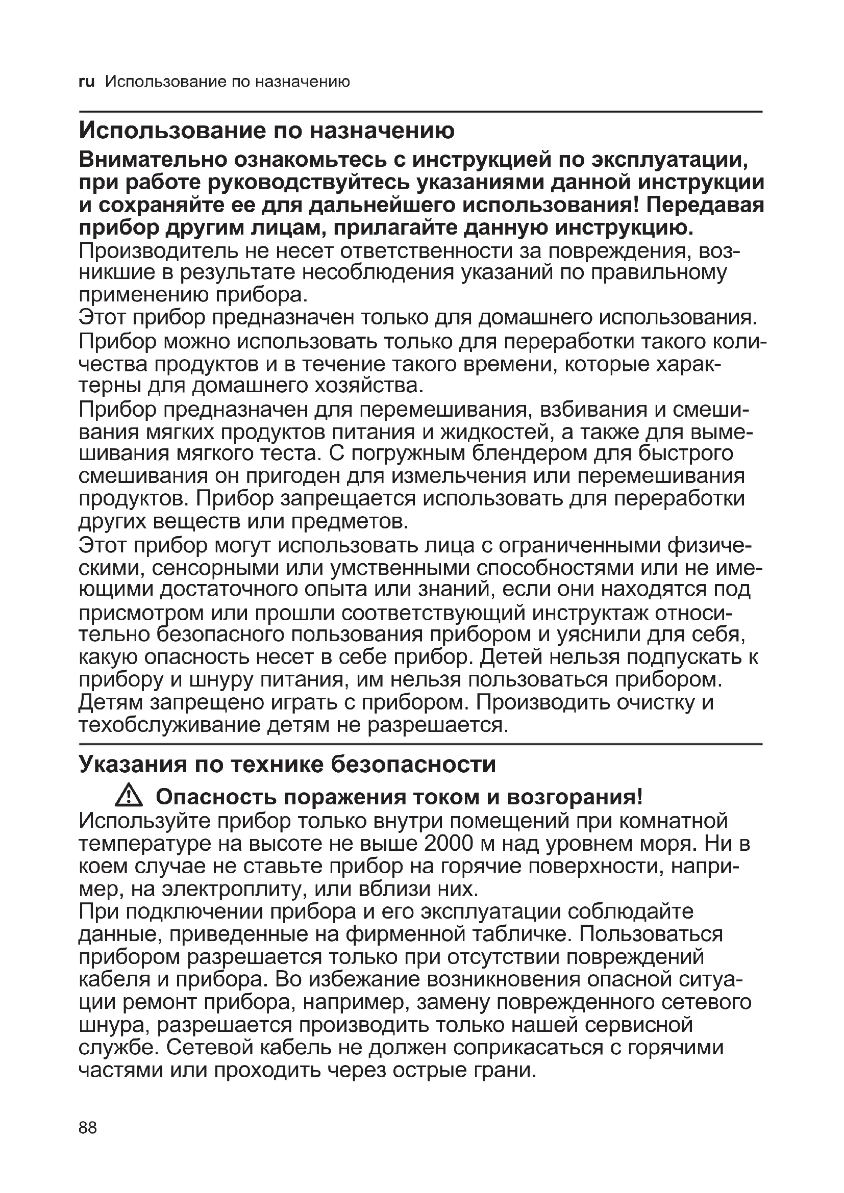 нашому представництві у Вас в країні. Умови гарантії для Німеччини та адреси Ви знайдете на останніх чотирьох сторінках цієї брошури. Крім того, умови гарантії розміщені також і в Інтернеті за зазначеною адресою. Для користування гарантійними послугами необхідно в будь-якому випадку показати квитанцію про оплату. Можливі зміни.88 ru Использование по назначению Использование по назначению Внимательно ознакомьтесь с инструкцией по эксплуатации, при работе руководствуйтесь указаниями данной инструкции и сохраняйте ее для дальнейшего использования! Передавая прибор другим лицам, прилагайте данную инструкцию. Производитель не несет ответственности за повреждения, воз- никшие в результате несоблюдения указаний по правильному применению прибора. Этот прибор предназначен только для домашнего использования. Прибор можно использовать только для переработки такого коли- чества продуктов и в течение такого времени, которые харак- терны для домашнего хозяйства. Прибор предназначен для перемешивания, взбивания и смеши- вания мягких продуктов питания и жидкостей, а также для выме- шивания мягкого теста. С погружным блендером для быстрого смешивания он пригоден для измельчения или перемешивания продуктов. Прибор запрещается использовать для переработки других веществ или предметов. Этот прибор могут использовать лица с ограниченными физиче- скими, сенсорными или умственными способностями или не име- ющими достаточного опыта или знаний, если они находятся под присмотром или прошли соответствующий инструктаж относи- тельно безопасного пользования прибором и уяснили для себя, какую опасность несет в себе прибор. Детей нельзя подпускать к прибору и шнуру питания, им нельзя пользоваться прибором. Детям запрещено играть с прибором. Производить очистку и техобслуживание детям не разрешается. Указания по технике безопасности W Опасность поражения током и возгорания! Используйте прибор только внутри помещений при комнатной температуре на высоте не выше 2000 м над уровнем моря. Ни в коем случае не ставьте прибор на горячие поверхности, напри- мер, на электроплиту, или вблизи них. При подключении прибора и его эксплуатации соблюдайте данные, приведенные на фирменной табличке. Пользоваться прибором разрешается только при отсутствии повреждений кабеля и прибора. Во избежание возникновения опасной ситуа- ции ремонт прибора, например, замену поврежденного сетевого шнура, разрешается производить только нашей сервисной службе. Сетевой кабель не должен соприкасаться с горячими частями или проходить через острые грани.89
