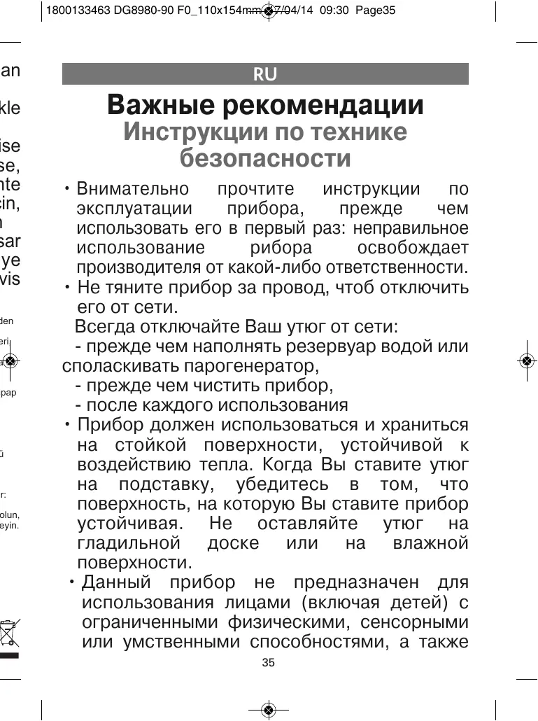 1800133463 DG8980-90 F0_110x154mm 17/04/14 09:30 Page36 лицами с недостаточным опытом и знаниями в области использования данного прибора, за исключением тех случаев, когда им помогает лицо, ответственное за их безопасность, которое присматривает за ними и предоставляет им предварительные инструкции по использованию прибора.
