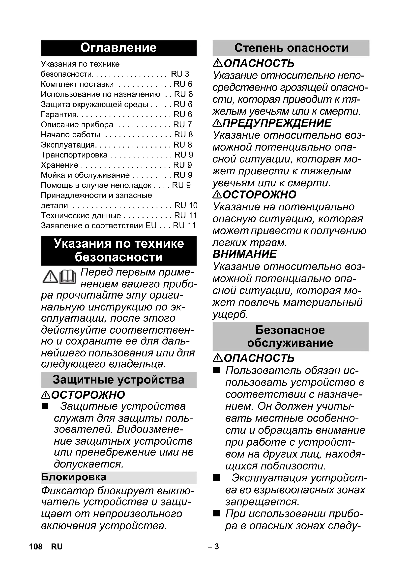 Указания по технике безопасности. . . . . . . . . . . . . . . . . . RU 3 Комплект поставки . . . . . . . . . . . . RU 6 Использование по назначению . . RU 6 Защита окружающей среды . . . . . RU 6 Гарантия. . . . . . . . . . . . . . . . . . . . . RU 6 Описание прибора . . . . . . . . . . . . RU 7 Начало работы . . . . . . . . . . . . . . . RU 8 Эксплуатация. . . . . . . . . . . . . . . . . RU 8 Транспортировка . . . . . . . . . . . . . . RU 9 Хранение . . . . . . . . . . . . . . . . . . . . RU 9 Мойка и обслуживание . . . . . . . . . RU 9 Помощь в случае неполадок . . . . RU 9 Принадлежности и запасные детали . . . . . . . . . . . . . . . . . . . . . . RU 10 Технические данные . . . . . . . . . . . RU 11 Заявление о соответствии ЕU . . . RU 11 Указания по технике безопасности Защитные устройства