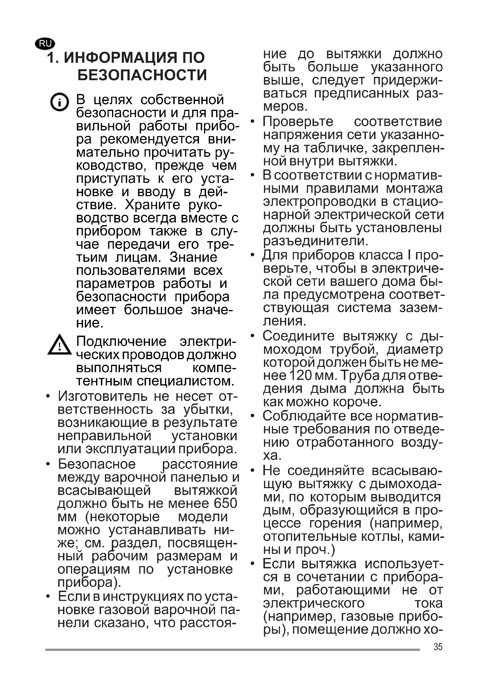 - Если вытяжка использует- ся в сочетании с прибора- ми, работающими не от электрического тока (например, газовые прибо- ры), помещение должно хо- 35рошо проветриваться во из- бежание обратного потока отходящих газов. При поль- зовании кухонной вытяж- кой в сочетании с прибора- ми, работающими не от электрического тока, отри- цательное давление в по- мещении не должно превы- шать 0,04 мбар с тем, чтобы дым не всасывался вытяж- кой обратно в помещение.