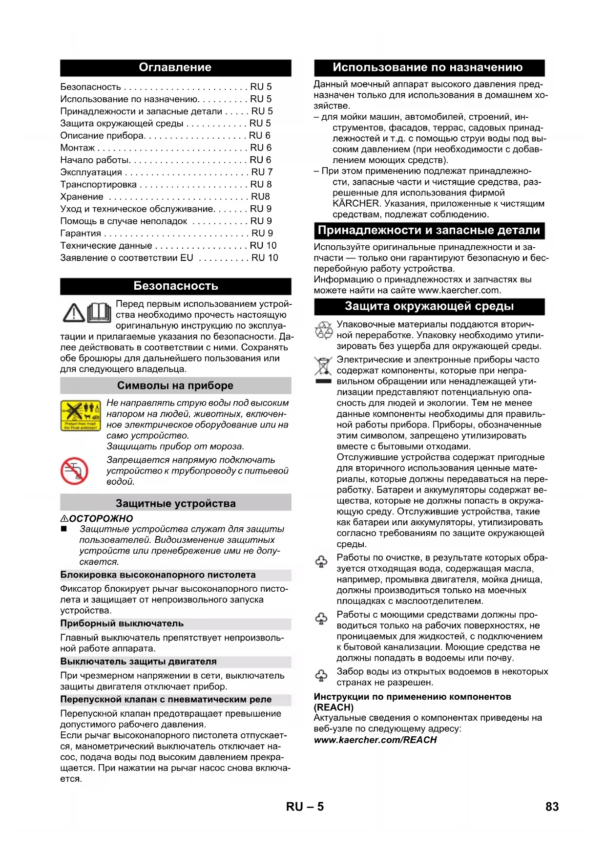 – для мойки машин, автомобилей, строений, ин- струментов, фасадов, террас, садовых принад- лежностей и т.д. с помощью струи воды под вы- соким давлением (при необходимости с добав- лением моющих средств). – При этом применению подлежат принадлежно- сти, запасные части и чистящие средства, раз- решенные для использования фирмой KÄRCHER. Указания, приложенные к чистящим средствам, подлежат соблюдению. Используйте оригинальные принадлежности и за- пчасти — только они гарантируют безопасную и бес- перебойную работу устройства. Информацию о принадлежностях и запчастях вы можете найти на сайте www.kaercher.com. Инструкции по применению компонентов (REACH) Актуальные сведения о компонентах приведены на веб-узле по следующему адресу: www.kaercher.com/REACH