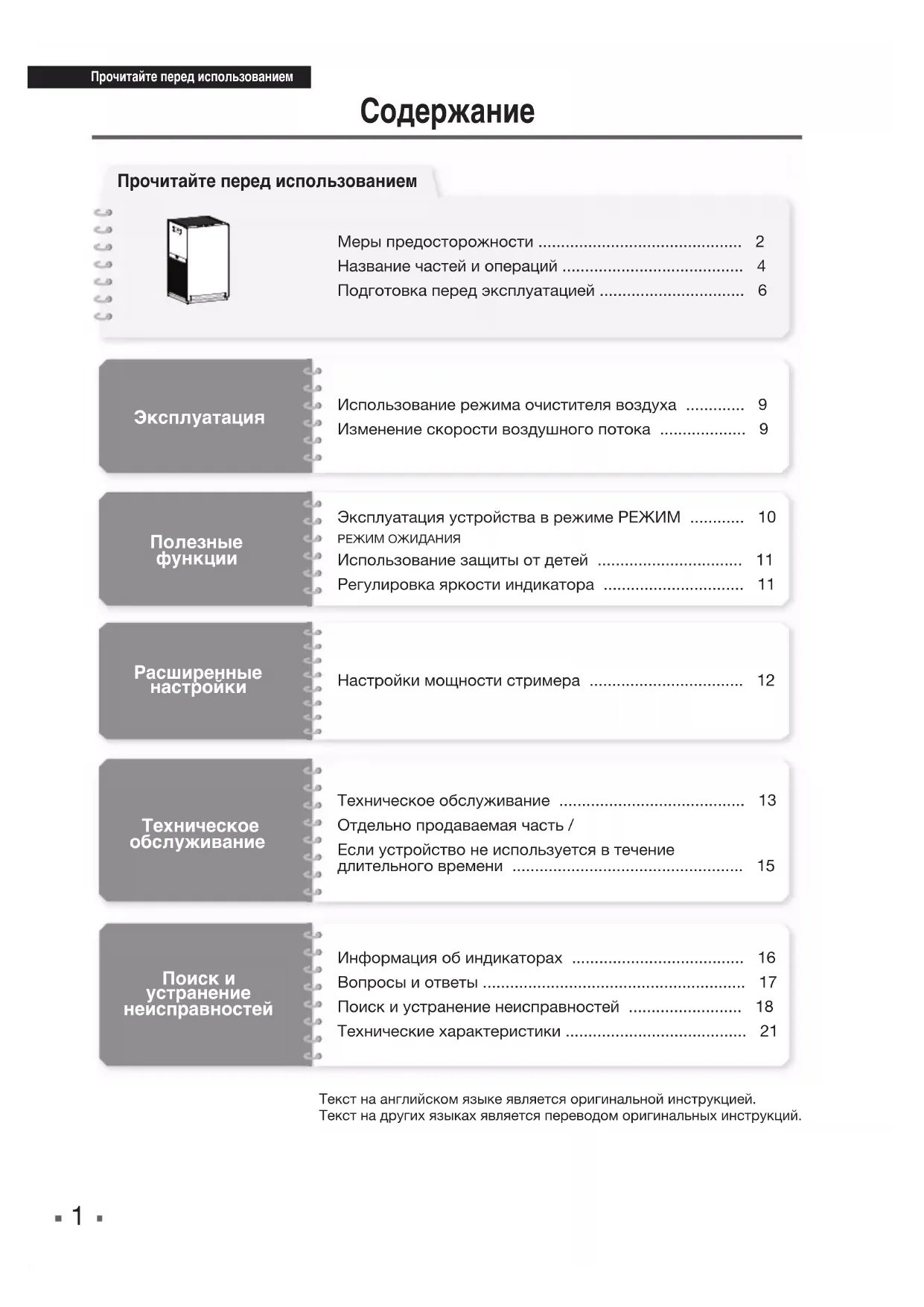 - Эксплуатация Использование режима очистителя воздуха p. 9