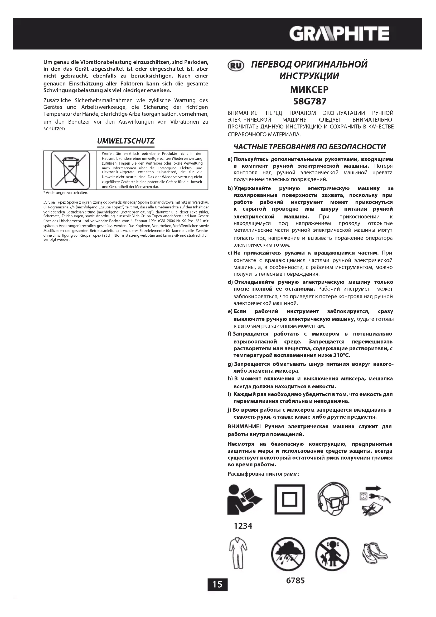 перемешивания стабильна и неподвижна. j) Во время работы с миксером запрещается вкладывать в емкость руки, а также какие-либо другие предметы. ВНИМАНИЕ! Ручная электрическая машина служит для работы внутри помещений. Несмотря на безопасную конструкцию, предпринятые защитные меры и использование средств защиты, всегда существует некоторый остаточный риск получения травмы во время работы. Расшифровка пиктограмм: