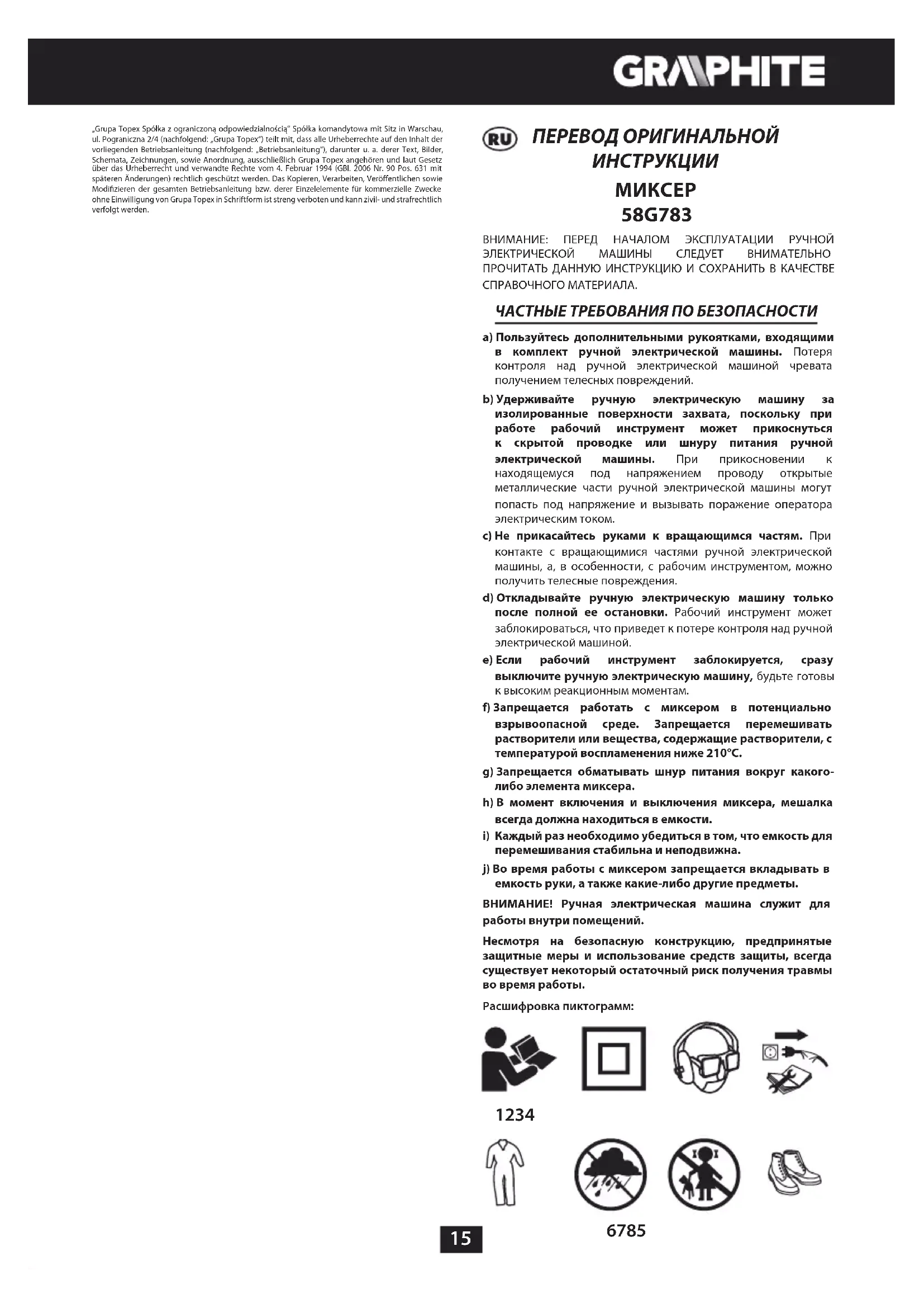 перемешивания стабильна и неподвижна. j) Во время работы с миксером запрещается вкладывать в емкость руки, а также какие-либо другие предметы. ВНИМАНИЕ! Ручная электрическая машина служит для работы внутри помещений. Несмотря на безопасную конструкцию, предпринятые защитные меры и использование средств защиты, всегда существует некоторый остаточный риск получения травмы во время работы. Расшифровка пиктограмм: