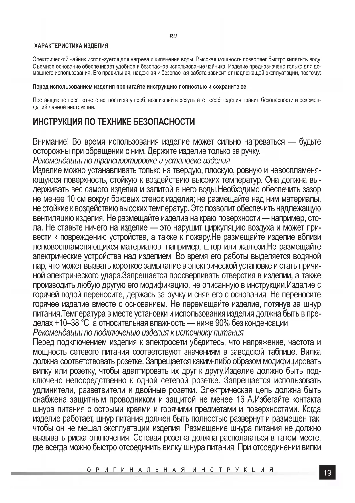 ХАРАКТЕРИСТИКА ИЗДЕЛИЯ Электрический чайник используется для нагрева и кипячения воды. Высокая мощность позволяет быстро кипятить воду. Съемное основание обеспечивает удобное и безопасное использование чайника. Изделие предназначено только для до- машнего использования. Его правильная, надежная и безопасная работа зависит от надлежащей эксплуатации, поэтому: Перед использованием изделия прочитайте инструкцию полностью и сохраните ее. Поставщик не несет ответственности за ущерб, возникший в результате несоблюдения правил безопасности и рекомен- даций данной инструкции. ИНСТРУКЦИЯ ПО ТЕХНИКЕ БЕЗОПАСНОСТИ Внимание! Во время использования изделие может сильно нагреваться — будьте осторожны при обращении с ним. Держите изделие только за ручку. Рекомендации по транспортировке и установке изделия Изделие можно устанавливать только на твердую, плоскую, ровную и невоспламеня- ющуюся поверхность, стойкую к воздействию высоких температур. Она должна вы- держивать вес самого изделия и залитой в него воды.Необходимо обеспечить зазор не менее 10 см вокруг боковых стенок изделия; не размещайте над ним материалы, не стойкие к воздействию высоких температур. Это позволит обеспечить надлежащую вентиляцию изделия. Не размещайте изделие на краю поверхности — например, сто- ла. Не ставьте ничего на изделие — это нарушит циркуляцию воздуха и может при- вести к повреждению устройства, а также к пожару.Не размещайте изделие вблизи легковоспламеняющихся материалов, например, штор или жалюзи.Не размещайте электрические устройства над изделием. Во время его работы выделяется водяной пар, что может вызвать короткое замыкание в электрической установке и стать причи- ной электрического удара.Запрещается просверливать отверстия в изделии, а также производить любую другую его модификацию, не описанную в инструкции.Изделие с горячей водой переносите, держась за ручку и сняв его с основания. Не переносите горячее изделие вместе с основанием. Не перемещайте изделие, потянув за шнур питания.Температура в месте установки и использования изделия должна быть в пре- делах +10–38 °C, а относительная влажность — ниже 90% без конденсации. Рекомендации по подключению изделия к источнику питания Перед подключением изделия к электросети убедитесь, что напряжение, частота и мощность сетевого питания соответствуют значениям в заводской таблице. Вилка должна соответствовать розетке. Запрещается каким-либо образом модифицировать вилку или розетку, чтобы адаптировать их друг к другу.Изделие должно быть под- ключено непосредственно к одной сетевой розетке. Запрещается использовать удлинители, разветвители и двойные розетки. Электрическая цепь должна быть снабжена защитным проводником и защитой не менее 16 A.Избегайте контакта шнура питания с острыми краями и горячими предметами и поверхностями. Когда изделие работает, шнур питания должен быть полностью развернут и размещен так, чтобы он не мешал эксплуатации изделия. Размещение шнура питания не должно вызывать риска отключения. Сетевая розетка должна располагаться в таком месте, где всегда можно быстро отсоединить вилку шнура питания. При отсоединении вилки20 ОРИГИНАЛЬНАЯ ИНСТРУКЦИЯ