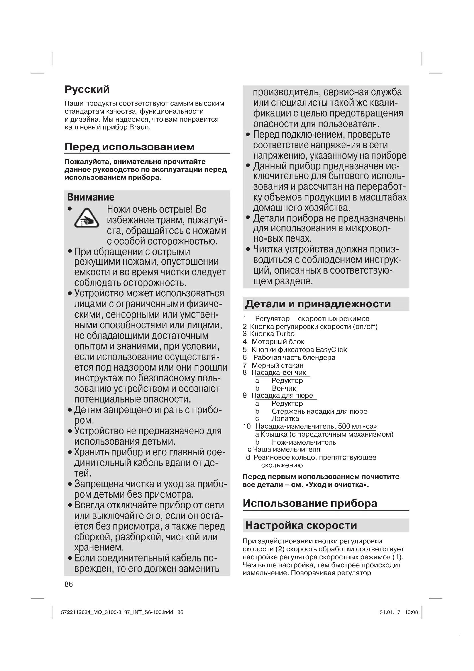 Перед первым использованием почистите все детали – см. «Уход и очистка». Использование прибора Настройка скорости При задействовании кнопки регулировки скорости (2) скорость обработки соответствует настройке регулятора скоростных режимов (1). Чем выше настройка, тем быстрее происходит измельчение. Поворачивая регулятор 5722112634_MQ_3100-3137_INT_S6-100.indd 865722112634_MQ_3100-3137_INT_S6-100.indd 86 31.01.17 10:0831.01.17 10:0887 скоростных режимов, можно удобно изменять скорость в процессе работы. Максимальную скорость обработки можно установить нажатием на кнопку Turbo (3). Кроме того, кнопку Turbo можно использовать для подачи коротких мощных импульсов без необходимости задействовать регулятор