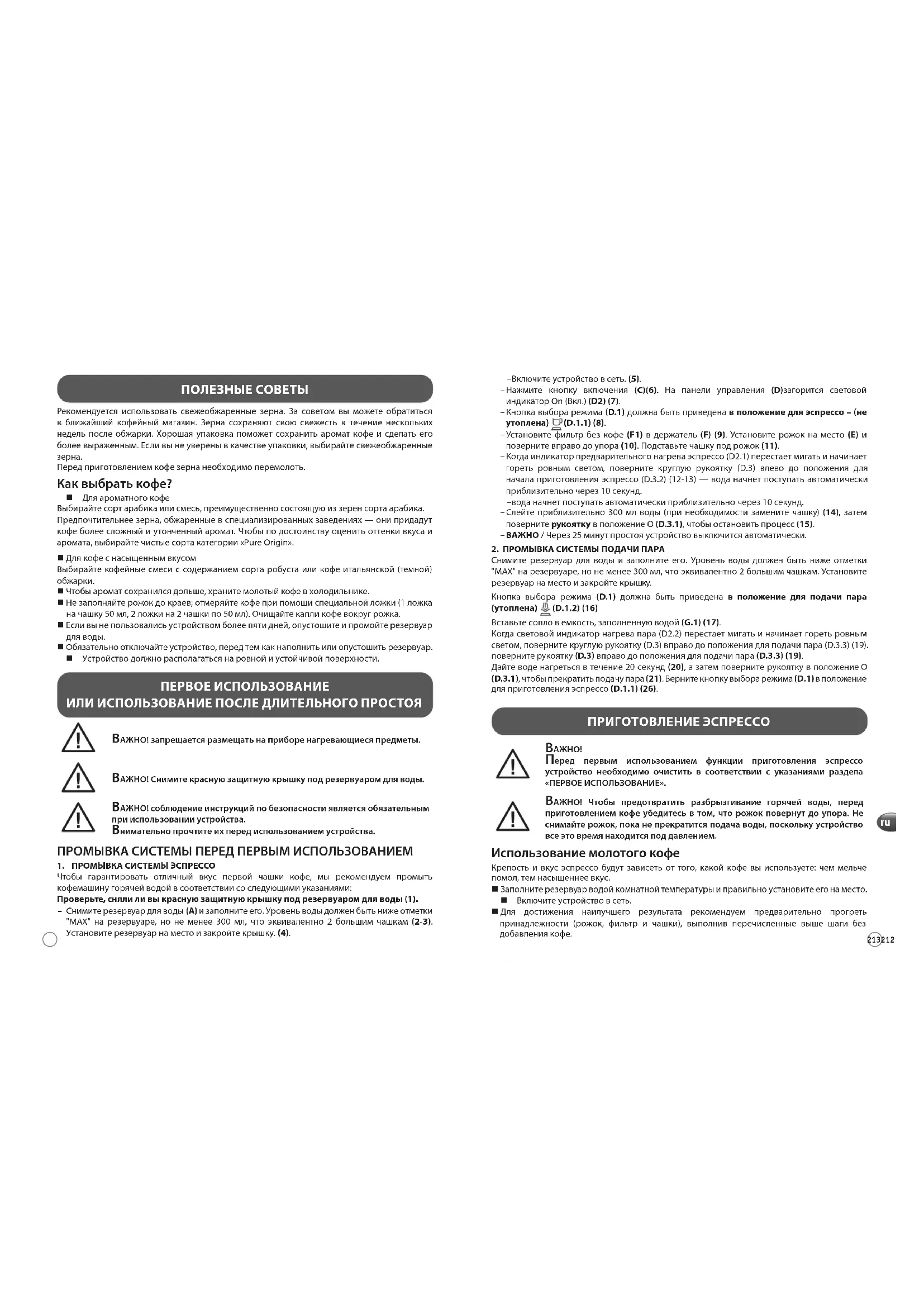 (D.1.2) (16) Вставьте сопло в емкость, заполненную водой (G.1) (17). Когда световой индикатор нагрева пара (D2.2) перестает мигать и начинает гореть ровным светом, поверните круглую рукоятку (D.3) вправо до положения для подачи пара (D.3.3) (19). поверните рукоятку (D.3) вправо до положения для подачи пара (D.3.3) (19). Дайте воде нагреться в течение 20 секунд (20), а затем поверните рукоятку в положениеO (D.3.1), чтобы прекратить подачу пара (21). Верните кнопку выбора режима (D.1) в положение для приготовления эспрессо (D.1.1) (26). ПЕРВОЕ ИСПОЛЬЗОВАНИЕ ИЛИ ИСПОЛЬЗОВАНИЕ ПОСЛЕ ДЛИТЕЛЬ НОГО ПРОСТОЯ ВАЖНО! запрещается размещать на приборе нагревающиеся предметы. ВАЖНО! Снимите красную защитную крышку под резервуаром для воды. ВАЖНО! соблюдение инструкций по безопасности является обязательным при использовании устройства. Внимательно прочтите их перед использованием устройства. ПОЛЕЗНЫЕ СОВЕТЫ Рекомендуется использовать свежеобжаренные зерна. За советом вы можете обратиться в ближайший кофейный магазин. Зерна сохраняют свою свежесть в течение нескольких недель после обжарки. Хорошая упаковка поможет сохранить аромат кофе и сделать его более выраженным. Если вы не уверены в качестве упаковки, выбирайте свежеобжаренные