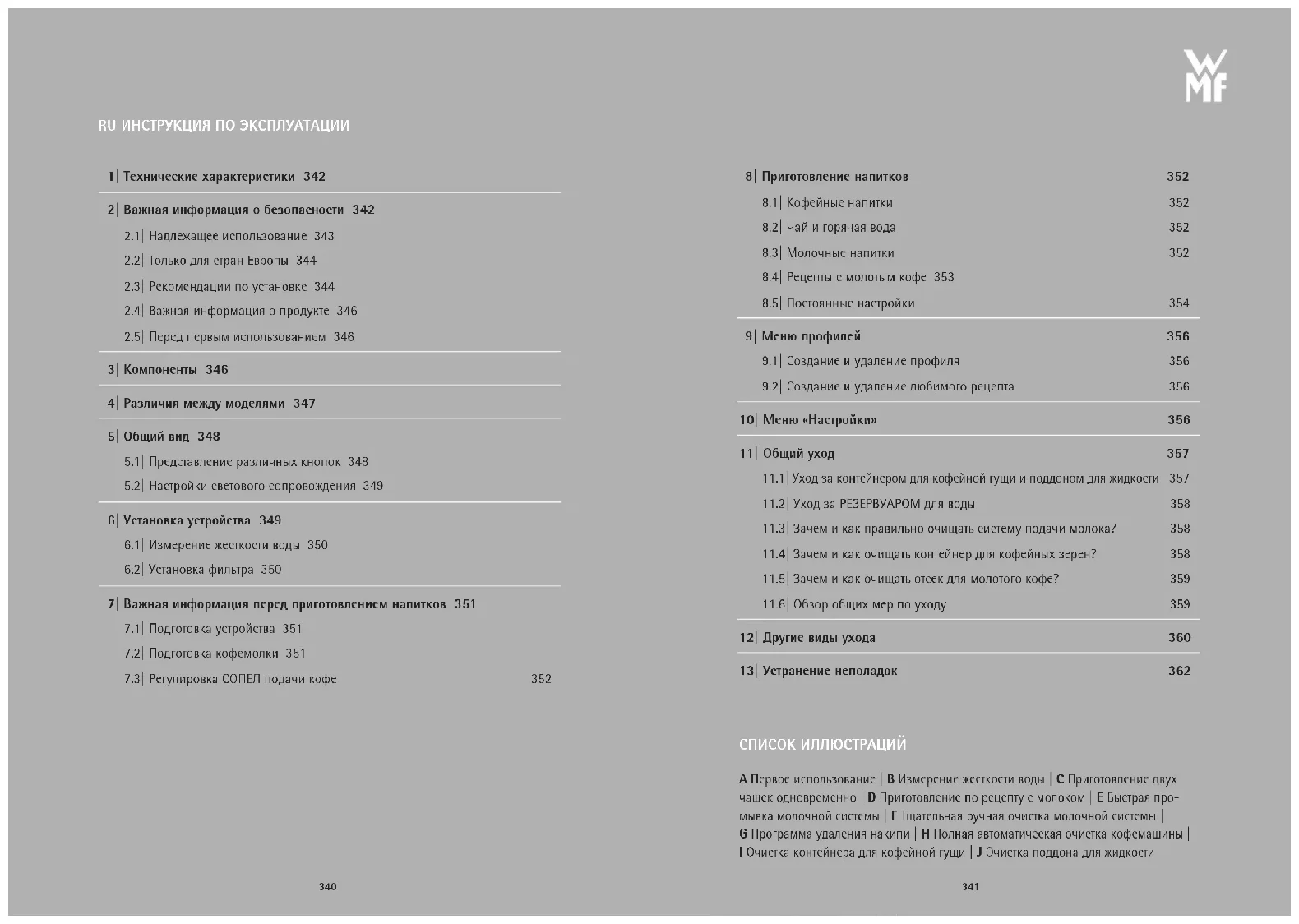 11.2|Уход за РЕЗЕРВУАРОМ для воды 358 11.3|Зачем и как правильно очищать систему подачи молока? 358 11.4|Зачем и как очищать контейнер для кофейных зерен? 358 11.5|Зачем и как очищать отсек для молотого кофе? 359 11.6|Обзор общих мер по уходу 359 12|Другие виды ухода 360 13|Устранение неполадок 362 СПИСОК ИЛЛЮСТРАЦИЙ A Первое использование| B Измерение жесткости воды| C Приготовление двух чашек одновременно| D Приготовление по рецепту с молоком| E Быстрая про- мывка молочной системы| F Тщательная ручная очистка молочной системы| GПрограмма удаления накипи| H Полная автоматическая очистка кофемашины| I Очистка контейнера для кофейной гущи| J Очистка поддона для жидкости 340 341СЕРИЯ WMF PERFECTION 700 АВТОМАТИЧЕСКАЯ КОФЕМАШИНА Поздравляем! Теперь вы – счастливый обла-датель автоматической кофемашины WMF Perfection. Напитки, которые употребляются чаще всего, можно приготовить нажатием одной кнопки на основной панели. Встроенный экран отображает информацию о прогрессе приготов ления кофе и обеспечивает быстрый доступ к различным меню. Большинство напитков можно приготовить сразу в двух порциях, что эконо-мит время.Мы очень надеемся, что автоматическая кофе-машина WMF Perfection будет радовать вас долгие годы. 1| ТЕХНИЧЕСКИЕ ХАРАКТЕРИСТИКИ Устройство: Автоматическая кофемашина WMF PerfectionПитание: 220–240 В, 50 ГцДавление помпы: 15 барКонтейнер для кофейных зерен: 250 гЕмкость контейнера для зерен: 15 порцийРезервуар для воды: 2 лЭнергопотребление: 1550 Вт (во время работы)Эксплуатация и хранение: Внутри помещений, в сухом месте (беречь от холода)Длина кабеля (м): прибл. 1,1Размеры (мм) В x Ш x Г: 395 x 285 x 480Вес (кг): 12,0Гарантийный период для этого устройства составляет 2 года. Подробную информацию о других условиях гарантии, действующих в вашей стране, см. в гарантийном документе.Производитель:SAS GSMRue Saint-Léonard F-53104 MayenneFrance (Франция) 2| ВАЖНАЯ ИНФОРМАЦИЯ О БЕЗОПАСНОСТИ В данной инструкции по эксплуатации важная информация обозначена с использованием символов и сигнальных слов. ПРЕДУПРЕЖДЕНИЕ – обозначает опасную ситуацию, которая может привести к серьез-ным травмам. ОСТОРОЖНО – обозначает потенциально опасную ситуацию, которая может привести к травмам легкой или средней степени тяжести. ВНИМАНИЕ – обозначает ситуацию, которая может стать причиной материального ущерба. ПРИМЕЧАНИЕ – обозначает дополнитель-ную информацию о безопасном использова-нии устройства.Символы – следует обратить внима-ние на обозначения и соблюдать их. 2.1| НАДЛЕЖАЩЕЕ ИСПОЛЬЗОВАНИЕ