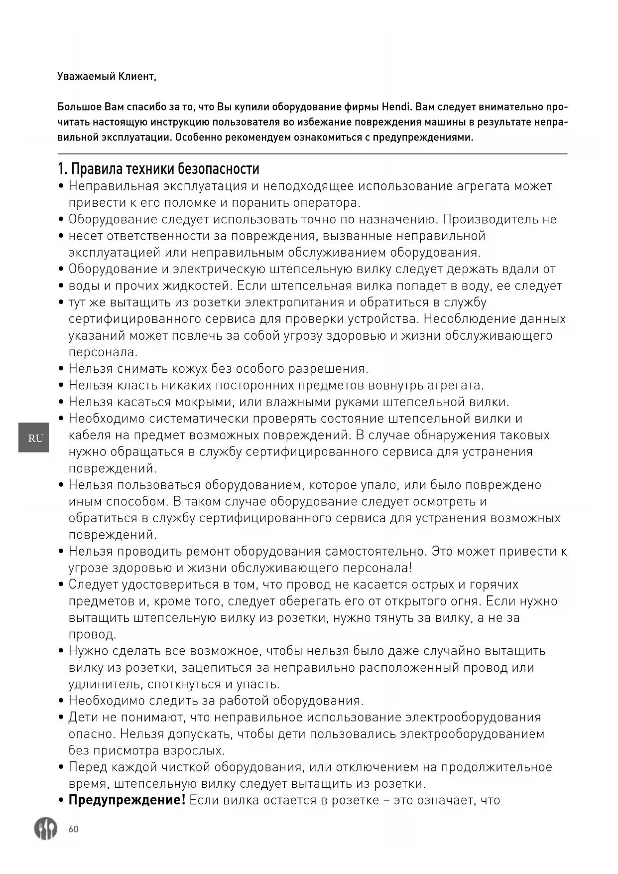 Уважаемый Клиент, Большое Вам спасибо за то, что Вы купили оборудование фирмы Hendi. Вам следует внимательно про- читать настоящую инструкцию пользователя во избежание повреждения машины в результате непра- вильной эксплуатации. Особенно рекомендуем ознакомиться с предупреждениями.