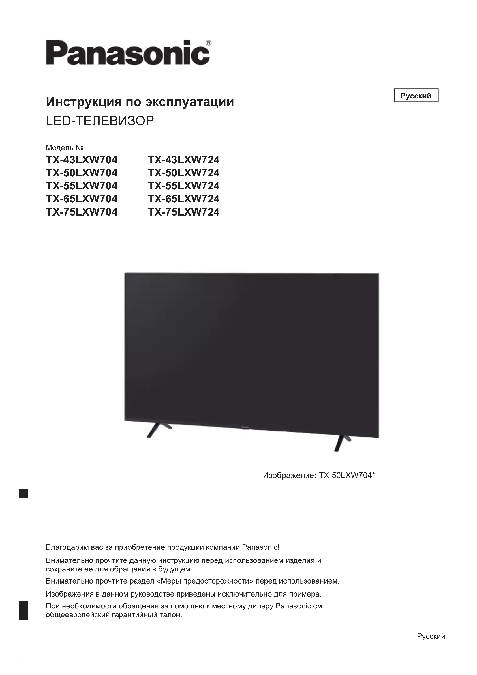 Благодарим вас за приобретение продукции компании Panasonic! Внимательно прочтите данную инструкцию перед использованием изделия и сохраните ее для обращения в будущем. Внимательно прочтите раздел «Меры предосторожности» перед использованием. Изображения в данном руководстве приведены исключительно для примера. При необходимости обращения за помощью к местному дилеру Panasonic см. общеевропейский гарантийный талон. Изображение: TX-50LXW704* РусскийРусский