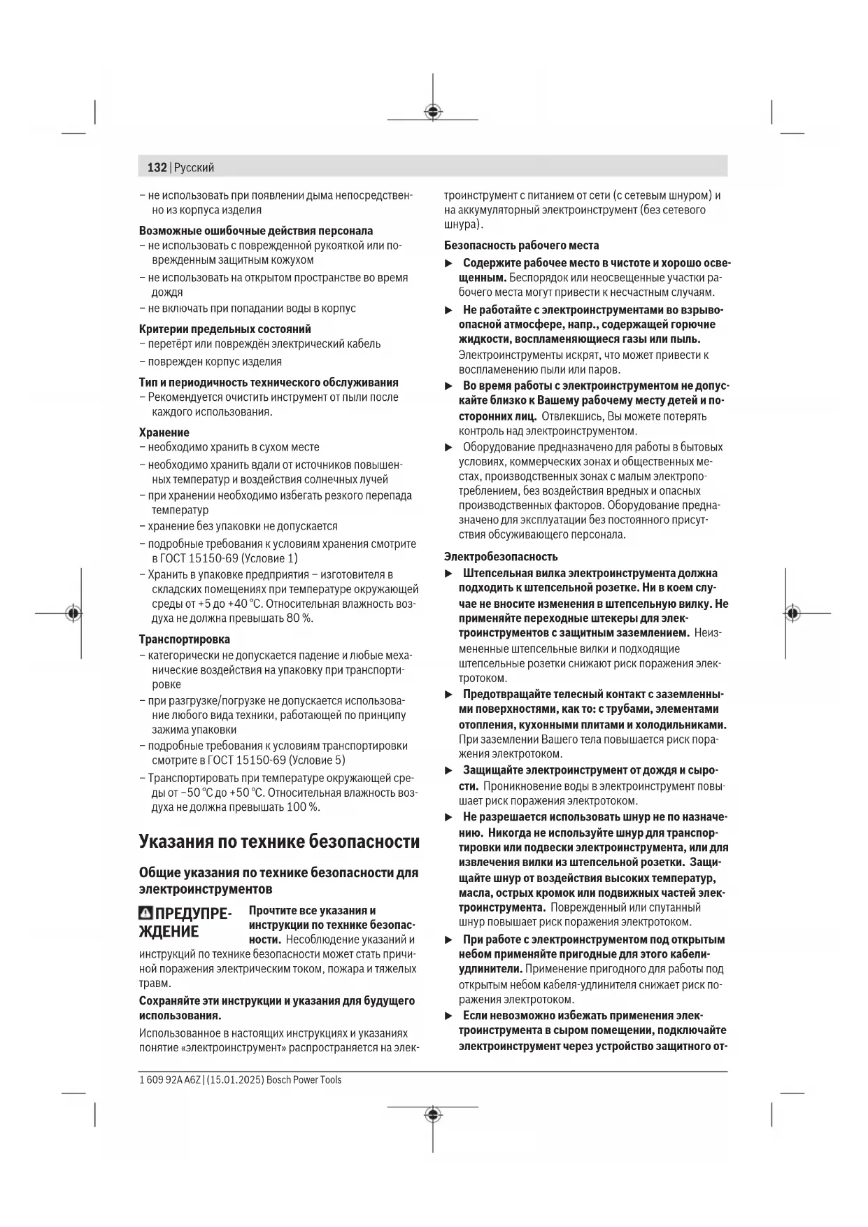 Toлько для стран Евразийского экономического союза (Таможенного союза) В состав эксплуатационных документов, предусмотрен- ных изготовителем для продукции, могут входить настоя- щее руководство по эксплуатации, а также приложения. Информация о подтверждении соответствия содержится в приложении. Информация о стране происхождения указана на корпу- се изделия и в приложении. Дата изготовления указана на последней странице об- ложки Руководства. Контактная информация относительно импортера содер- жится на упаковке. Срок службы изделия Срок службы изделия составляет 7 лет. Не рекомендует- ся к эксплуатации по истечении 5 лет хранения с даты изготовления без предварительной проверки (дату изго- товления см. на этикетке). Указанный срок службы действителен при соблюдении потребителем требований настоящего руководства. Перечень критических отказов – не использовать при сильном искрении – не использовать при появлении сильной вибрации – не использовать с перебитым или оголённым электри- ческим кабелем Bosch Power Tools 1 609 92A A6Z | (15.01.2025)132 | Русский – не использовать при появлении дыма непосредствен- но из корпуса изделия Возможные ошибочные действия персонала – не использовать с поврежденной рукояткой или по- врежденным защитным кожухом – не использовать на открытом пространстве во время