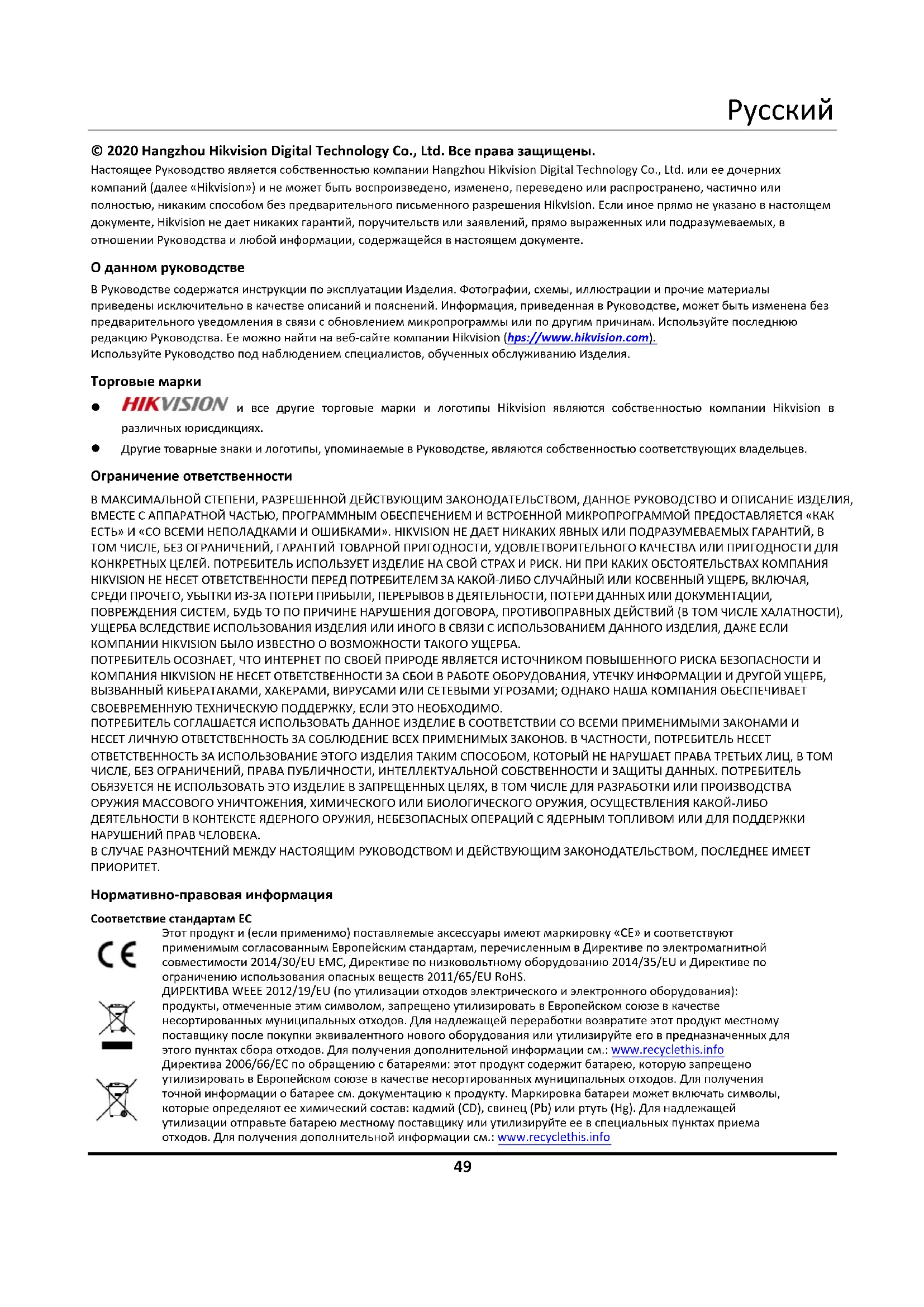 © 2020 Hangzhou Hikvision Digital Technology Co., Ltd. Все права защищены. Настоящее Руководство является собственностью компании Hangzhou Hikvision Digital Technology Co., Ltd. или ее дочерних компаний (далее «Hikvision») и не может быть воспроизведено, изменено, переведено или распространено, частично или полностью, никаким способом без предварительного письменного разрешения Hikvision. Если иное прямо не указано в настоящем документе, Hikvision не дает никаких гарантий, поручительств или заявлений, прямо выраженных или подразумеваемых, в отношении Руководства и любой информации, содержащейся в настоящем документе. О данном руководстве В Руководстве содержатся инструкции по эксплуатации Изделия. Фотографии, схемы, иллюстрации и прочие материалы приведены исключительно в качестве описаний и пояснений. Информация, приведенная в Руководстве, может быть изменена без предварительного уведомления в связи с обновлением микропрограммы или по другим причинам. Используйте последнюю редакцию Руководства. Ее можно найти на веб-сайте компании Hikvision (https://www.hikvision.com). Используйте Руководство под наблюдением специалистов, обученных обслуживанию Изделия. Торговые марки и все другие торговые марки и логотипы Hikvision являются собственностью компании Hikvision в различных юрисдикциях. Другие товарные знаки и логотипы, упоминаемые в Руководстве, являются собственностью соответствующих владельцев. Ограничение ответственности В МАКСИМАЛЬНОЙ СТЕПЕНИ, РАЗРЕШЕННОЙ ДЕЙСТВУЮЩИМ ЗАКОНОДАТЕЛЬСТВОМ, ДАННОЕ РУКОВОДСТВО И ОПИСАНИЕ ИЗДЕЛИЯ, ВМЕСТЕ С АППАРАТНОЙ ЧАСТЬЮ, ПРОГРАММНЫМ ОБЕСПЕЧЕНИЕМ И ВСТРОЕННОЙ МИКРОПРОГРАММОЙ ПРЕДОСТАВЛЯЕТСЯ «КАК ЕСТЬ» И «СО ВСЕМИ НЕПОЛАДКАМИ И ОШИБКАМИ». HIKVISION НЕ ДАЕТ НИКАКИХ ЯВНЫХ ИЛИ ПОДРАЗУМЕВАЕМЫХ ГАРАНТИЙ, В ТОМ ЧИСЛЕ, БЕЗ ОГРАНИЧЕНИЙ, ГАРАНТИЙ ТОВАРНОЙ ПРИГОДНОСТИ, УДОВЛЕТВОРИТЕЛЬНОГО КАЧЕСТВА ИЛИ ПРИГОДНОСТИ ДЛЯ КОНКРЕТНЫХ ЦЕЛЕЙ. ПОТРЕБИТЕЛЬ ИСПОЛЬЗУЕТ ИЗДЕЛИЕ НА СВОЙ СТРАХ И РИСК. НИ ПРИ КАКИХ ОБСТОЯТЕЛЬСТВАХ КОМПАНИЯ HIKVISION НЕ НЕСЕТ ОТВЕТСТВЕННОСТИ ПЕРЕД ПОТРЕБИТЕЛЕМ ЗА КАКОЙ-ЛИБО СЛУЧАЙНЫЙ ИЛИ КОСВЕННЫЙ УЩЕРБ, ВКЛЮЧАЯ, СРЕДИ ПРОЧЕГО, УБЫТКИ ИЗ-ЗА ПОТЕРИ ПРИБЫЛИ, ПЕРЕРЫВОВ В ДЕЯТЕЛЬНОСТИ, ПОТЕРИ ДАННЫХ ИЛИ ДОКУМЕНТАЦИИ, ПОВРЕЖДЕНИЯ СИСТЕМ, БУДЬ ТО ПО ПРИЧИНЕ НАРУШЕНИЯ ДОГОВОРА, ПРОТИВОПРАВНЫХ ДЕЙСТВИЙ (В ТОМ ЧИСЛЕ ХАЛАТНОСТИ), УЩЕРБА ВСЛЕДСТВИЕ ИСПОЛЬЗОВАНИЯ ИЗДЕЛИЯ ИЛИ ИНОГО В СВЯЗИ С ИСПОЛЬЗОВАНИЕМ ДАННОГО ИЗДЕЛИЯ, ДАЖЕ ЕСЛИ КОМПАНИИ HIKVISION БЫЛО ИЗВЕСТНО О ВОЗМОЖНОСТИ ТАКОГО УЩЕРБА. ПОТРЕБИТЕЛЬ ОСОЗНАЕТ, ЧТО ИНТЕРНЕТ ПО СВОЕЙ ПРИРОДЕ ЯВЛЯЕТСЯ ИСТОЧНИКОМ ПОВЫШЕННОГО РИСКА БЕЗОПАСНОСТИ И КОМПАНИЯ HIKVISION НЕ НЕСЕТ ОТВЕТСТВЕННОСТИ ЗА СБОИ В РАБОТЕ ОБОРУДОВАНИЯ, УТЕЧКУ ИНФОРМАЦИИ И ДРУГОЙ УЩЕРБ, ВЫЗВАННЫЙ КИБЕРАТАКАМИ, ХАКЕРАМИ, ВИРУСАМИ ИЛИ СЕТЕВЫМИ УГРОЗАМИ; ОДНАКО НАША КОМПАНИЯ ОБЕСПЕЧИВАЕТ СВОЕВРЕМЕННУЮ ТЕХНИЧЕСКУЮ ПОДДЕРЖКУ, ЕСЛИ ЭТО НЕОБХОДИМО. ПОТРЕБИТЕЛЬ СОГЛАШАЕТСЯ ИСПОЛЬЗОВАТЬ ДАННОЕ ИЗДЕЛИЕ В СООТВЕТСТВИИ СО ВСЕМИ ПРИМЕНИМЫМИ ЗАКОНАМИ И НЕСЕТ ЛИЧНУЮ ОТВЕТСТВЕННОСТЬ ЗА СОБЛЮДЕНИЕ ВСЕХ ПРИМЕНИМЫХ ЗАКОНОВ. В ЧАСТНОСТИ, ПОТРЕБИТЕЛЬ НЕСЕТ ОТВЕТСТВЕННОСТЬ ЗА ИСПОЛЬЗОВАНИЕ ЭТОГО ИЗДЕЛИЯ ТАКИМ СПОСОБОМ, КОТОРЫЙ НЕ НАРУШАЕТ ПРАВА ТРЕТЬИХ ЛИЦ, В ТОМ ЧИСЛЕ, БЕЗ ОГРАНИЧЕНИЙ, ПРАВА ПУБЛИЧНОСТИ, ИНТЕЛЛЕКТУАЛЬНОЙ СОБСТВЕННОСТИ И ЗАЩИТЫ ДАННЫХ. ПОТРЕБИТЕЛЬ ОБЯЗУЕТСЯ НЕ ИСПОЛЬЗОВАТЬ ЭТО ИЗДЕЛИЕ В ЗАПРЕЩЕННЫХ ЦЕЛЯХ, В ТОМ ЧИСЛЕ ДЛЯ РАЗРАБОТКИ ИЛИ ПРОИЗВОДС