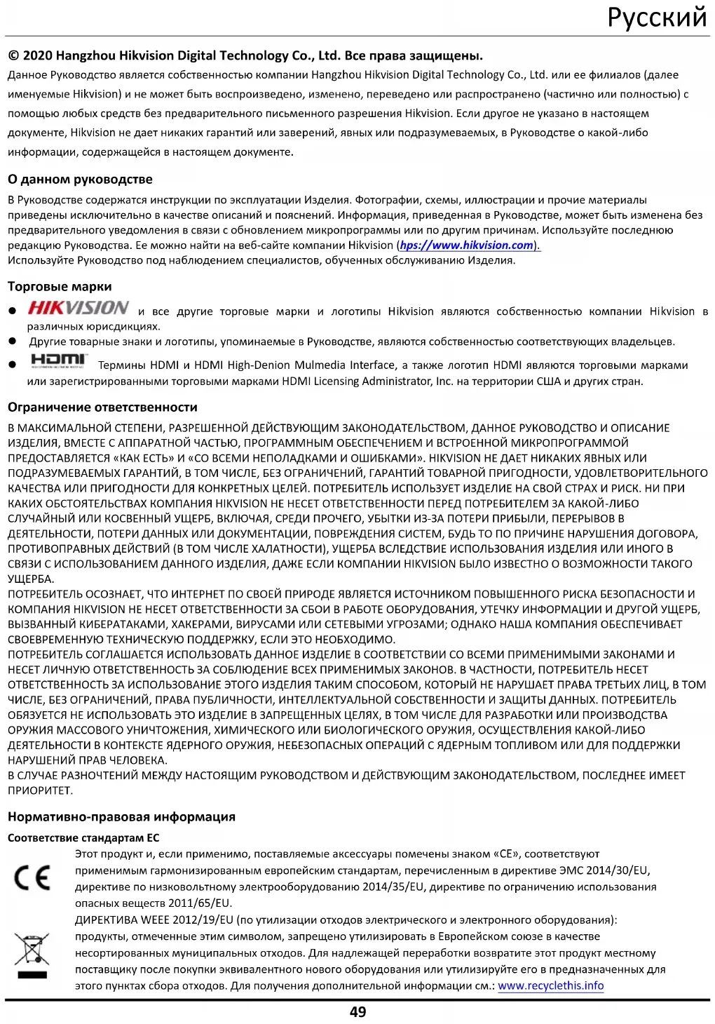 © 2020 Hangzhou Hikvision Digital Technology Co., Ltd. Все права защищены. Данное Руководство является собственностью компании Hangzhou Hikvision Digital Technology Co., Ltd. или ее филиалов (далее именуемые Hikvision) и не может быть воспроизведено, изменено, переведено или распространено (частично или полностью) с помощью любых средств без предварительного письменного разрешения Hikvision. Если другое не указано в настоящем документе, Hikvision не дает никаких гарантий или заверений, явных или подразумеваемых, в Руководстве о какой-либо информации, содержащейся в настоящем документе. О данном руководстве В Руководстве содержатся инструкции по эксплуатации Изделия. Фотографии, схемы, иллюстрации и прочие материалы приведены исключительно в качестве описаний и пояснений. Информация, приведенная в Руководстве, может быть изменена без предварительного уведомления в связи с обновлением микропрограммы или по другим причинам. Используйте последнюю редакцию Руководства. Ее можно найти на веб-сайте компании Hikvision (https://www.hikvision.com). Используйте Руководство под наблюдением специалистов, обученных обслуживанию Изделия. Торговые марки и все другие торговые марки и логотипы Hikvision являются собственностью компании Hikvision в различных юрисдикциях. Другие товарные знаки и логотипы, упоминаемые в Руководстве, являются собственностью соответствующих владельцев. Термины HDMI и HDMI High-Definition Multimedia Interface, а также логотип HDMI являются торговыми марками или зарегистрированными торговыми марками HDMI Licensing Administrator, Inc. на территории США и других стран. Ограничение ответственности В МАКСИМАЛЬНОЙ СТЕПЕНИ, РАЗРЕШЕННОЙ ДЕЙСТВУЮЩИМ ЗАКОНОДАТЕЛЬСТВОМ, ДАННОЕ РУКОВОДСТВО И ОПИСАНИЕ ИЗДЕЛИЯ, ВМЕСТЕ С АППАРАТНОЙ ЧАСТЬЮ, ПРОГРАММНЫМ ОБЕСПЕЧЕНИЕМ И ВСТРОЕННОЙ МИКРОПРОГРАММОЙ ПРЕДОСТАВЛЯЕТСЯ «КАК ЕСТЬ» И «СО ВСЕМИ НЕПОЛАДКАМИ И ОШИБКАМИ». HIKVISION НЕ ДАЕТ НИКАКИХ ЯВНЫХ ИЛИ ПОДРАЗУМЕВАЕМЫХ ГАРАНТИЙ, В ТОМ ЧИСЛЕ, БЕЗ ОГРАНИЧЕНИЙ, ГАРАНТИЙ ТОВАРНОЙ ПРИГОДНОСТИ, УДОВЛЕТВОРИТЕЛЬНОГО КАЧЕСТВА ИЛИ ПРИГОДНОСТИ ДЛЯ КОНКРЕТНЫХ ЦЕЛЕЙ. ПОТРЕБИТЕЛЬ ИСПОЛЬЗУЕТ ИЗДЕЛИЕ НА СВОЙ СТРАХ И РИСК. НИ ПРИ КАКИХ ОБСТОЯТЕЛЬСТВАХ КОМПАНИЯ HIKVISION НЕ НЕСЕТ ОТВЕТСТВЕННОСТИ ПЕРЕД ПОТРЕБИТЕЛЕМ ЗА КАКОЙ-ЛИБО СЛУЧАЙНЫЙ ИЛИ КОСВЕННЫЙ УЩЕРБ, ВКЛЮЧАЯ, СРЕДИ ПРОЧЕГО, УБЫТКИ ИЗ-ЗА ПОТЕРИ ПРИБЫЛИ, ПЕРЕРЫВОВ В ДЕЯТЕЛЬНОСТИ, ПОТЕРИ ДАННЫХ ИЛИ ДОКУМЕНТАЦИИ, ПОВРЕЖДЕНИЯ СИСТЕМ, БУДЬ ТО ПО ПРИЧИНЕ НАРУШЕНИЯ ДОГОВОРА, ПРОТИВОПРАВНЫХ ДЕЙСТВИЙ (В ТОМ ЧИСЛЕ ХАЛАТНОСТИ), УЩЕРБА ВСЛЕДСТВИЕ ИСПОЛЬЗОВАНИЯ ИЗДЕЛИЯ ИЛИ ИНОГО В СВЯЗИ С ИСПОЛЬЗОВАНИЕМ ДАННОГО ИЗДЕЛИЯ, ДАЖЕ ЕСЛИ КОМПАНИИ HIKVISION БЫЛО ИЗВЕСТНО О ВОЗМОЖНОСТИ ТАКОГО УЩЕРБА. ПОТРЕБИТЕЛЬ ОСОЗНАЕТ, ЧТО ИНТЕРНЕТ ПО СВОЕЙ ПРИРОДЕ ЯВЛЯЕТСЯ ИСТОЧНИКОМ ПОВЫШЕННОГО РИСКА БЕЗОПАСНОСТИ И КОМПАНИЯ HIKVISION НЕ НЕСЕТ ОТВЕТСТВЕННОСТИ ЗА СБОИ В РАБОТЕ ОБОРУДОВАНИЯ, УТЕЧКУ ИНФОРМАЦИИ И ДРУГОЙ УЩЕРБ, ВЫЗВАННЫЙ КИБЕРАТАКАМИ, ХАКЕРАМИ, ВИРУСАМИ ИЛИ СЕТЕВЫМИ УГРОЗАМИ; ОДНАКО НАША КОМПАНИЯ ОБЕСПЕЧИВАЕТ СВОЕВРЕМЕННУЮ ТЕХНИЧЕСКУЮ ПОДДЕРЖКУ, ЕСЛИ ЭТО НЕОБХОДИМО. ПОТРЕБИТЕЛЬ СОГЛАШАЕТСЯ ИСПОЛЬЗОВАТЬ ДАННОЕ ИЗДЕЛИЕ В СООТВЕТСТВИИ СО ВСЕМИ ПРИМЕНИМЫМИ ЗАКОНАМИ И НЕСЕТ ЛИЧНУЮ ОТВЕТСТВЕННОСТЬ ЗА СОБЛЮДЕНИЕ ВСЕХ ПРИМЕНИМЫХ ЗАКОНОВ. В ЧАСТНОСТИ, ПОТРЕБИТЕЛЬ НЕСЕТ ОТВЕТСТВЕННОСТЬ ЗА ИСПОЛЬЗОВАНИЕ ЭТОГО ИЗДЕЛИЯ ТАКИМ СПОСОБОМ, КОТОРЫЙ НЕ НАРУШАЕТ ПРАВА ТРЕТЬИХ ЛИЦ, В ТОМ ЧИСЛЕ, БЕЗ ОГРАНИЧЕНИЙ, ПРАВА ПУБЛИЧНОСТИ, ИНТЕЛЛЕКТУАЛЬНО