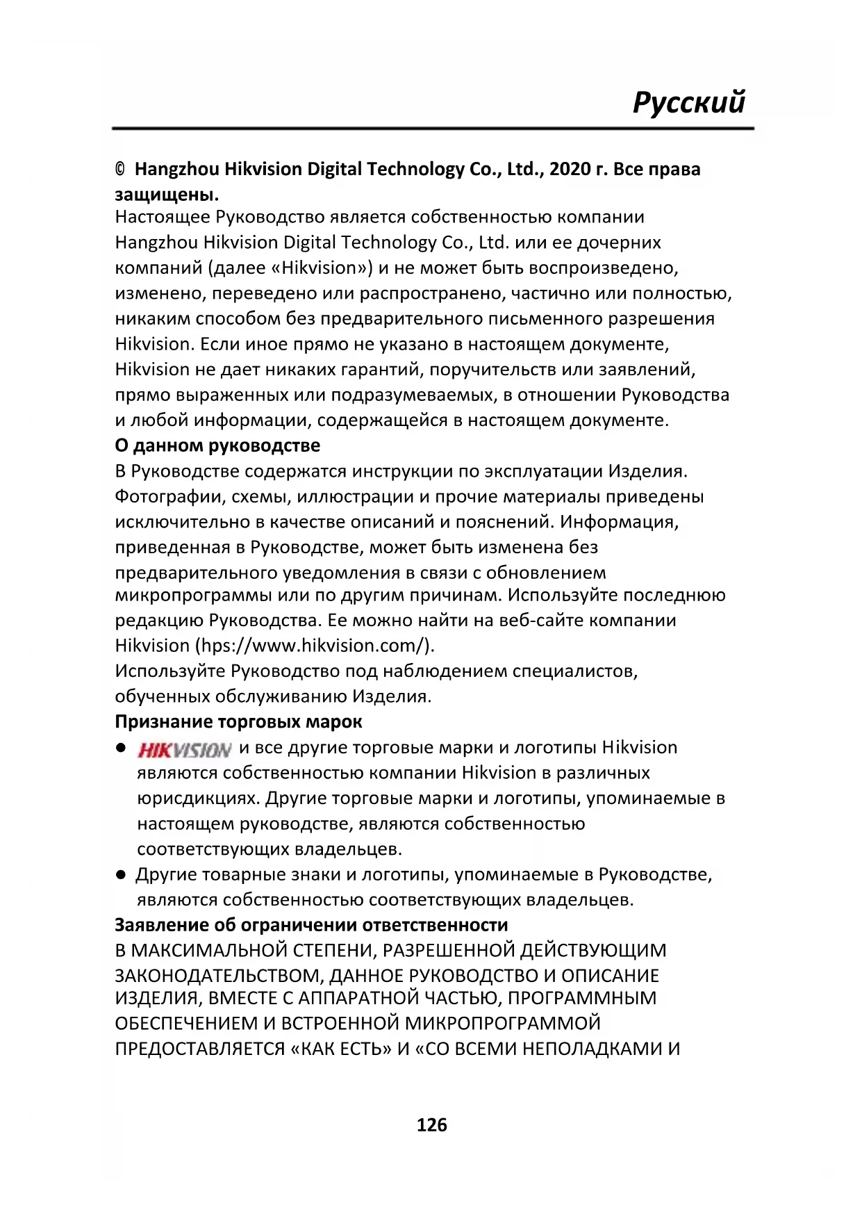 Настоящее Руководство является собственностью компании Hangzhou Hikvision Digital Technology Co., Ltd. или ее дочерних компаний (далее «Hikvision») и не может быть воспроизведено, изменено, переведено или распространено, частично или полностью, никаким способом без предварительного письменного разрешения Hikvision. Если иное прямо не указано в настоящем документе, Hikvision не дает никаких гарантий, поручительств или заявлений, прямо выраженных или подразумеваемых, в отношении Руководства и любой информации, содержащейся в настоящем документе. О данном руководстве В Руководстве содержатся инструкции по эксплуатации Изделия. Фотографии, схемы, иллюстрации и прочие материалы приведены исключительно в качестве описаний и пояснений. Информация, приведенная в Руководстве, может быть изменена без предварительного уведомления в связи с обновлением микропрограммы или по другим причинам. Используйте последнюю редакцию Руководства. Ее можно найти на веб-сайте компании Hikvision (https://www.hikvision.com/). Используйте Руководство под наблюдением специалистов, обученных обслуживанию Изделия. Признание торговых марок и все другие торговые марки и логотипы Hikvision являются собственностью компании Hikvision в различных юрисдикциях. Другие торговые марки и логотипы, упоминаемые в настоящем руководстве, являются собственностью соответствующих владельцев. Другие товарные знаки и логотипы, упоминаемые в Руководстве, являются собственностью соответствующих владельцев. Заявление об ограничении ответственности В МАКСИМАЛЬНОЙ СТЕПЕНИ, РАЗРЕШЕННОЙ ДЕЙСТВУЮЩИМ ЗАКОНОДАТЕЛЬСТВОМ, ДАННОЕ РУКОВОДСТВО И ОПИСАНИЕ ИЗДЕЛИЯ, ВМЕСТЕ С АППАРАТНОЙ ЧАСТЬЮ, ПРОГРАММНЫМ ОБЕСПЕЧЕНИЕМ И ВСТРОЕННОЙ МИКРОПРОГРАММОЙ ПРЕДОСТАВЛЯЕТСЯ «КАК ЕСТЬ» И «СО ВСЕМИ НЕПОЛАДКАМИ ИРусский