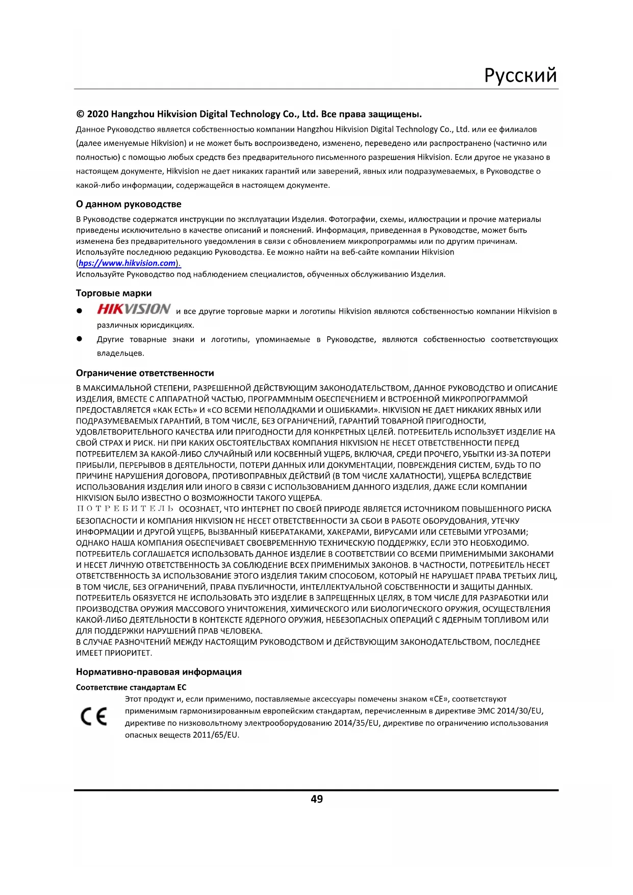 © 2020 Hangzhou Hikvision Digital Technology Co., Ltd. Все права защищены. Данное Руководство является собственностью компании Hangzhou Hikvision Digital Technology Co., Ltd. или ее филиалов (далее именуемые Hikvision) и не может быть воспроизведено, изменено, переведено или распространено (частично или полностью) с помощью любых средств без предварительного письменного разрешения Hikvision. Если другое не указано в настоящем документе, Hikvision не дает никаких гарантий или заверений, явных или подразумеваемых, в Руководстве о какой-либо информации, содержащейся в настоящем документе. О данном руководстве В Руководстве содержатся инструкции по эксплуатации Изделия. Фотографии, схемы, иллюстрации и прочие материалы приведены исключительно в качестве описаний и пояснений. Информация, приведенная в Руководстве, может быть изменена без предварительного уведомления в связи с обновлением микропрограммы или по другим причинам. Используйте последнюю редакцию Руководства. Ее можно найти на веб-сайте компании Hikvision (https://www.hikvision.com). Используйте Руководство под наблюдением специалистов, обученных обслуживанию Изделия. Торговые марки и все другие торговые марки и логотипы Hikvision являются собственностью компании Hikvision в различных юрисдикциях. Другие товарные знаки и логотипы, упоминаемые в Руководстве, являются собственностью соответствующих владельцев. Ограничение ответственности В МАКСИМАЛЬНОЙ СТЕПЕНИ, РАЗРЕШЕННОЙ ДЕЙСТВУЮЩИМ ЗАКОНОДАТЕЛЬСТВОМ, ДАННОЕ РУКОВОДСТВО И ОПИСАНИЕ ИЗДЕЛИЯ, ВМЕСТЕ С АППАРАТНОЙ ЧАСТЬЮ, ПРОГРАММНЫМ ОБЕСПЕЧЕНИЕМ И ВСТРОЕННОЙ МИКРОПРОГРАММОЙ ПРЕДОСТАВЛЯЕТСЯ «КАК ЕСТЬ» И «СО ВСЕМИ НЕПОЛАДКАМИ И ОШИБКАМИ». HIKVISION НЕ ДАЕТ НИКАКИХ ЯВНЫХ ИЛИ ПОДРАЗУМЕВАЕМЫХ ГАРАНТИЙ, В ТОМ ЧИСЛЕ, БЕЗ ОГРАНИЧЕНИЙ, ГАРАНТИЙ ТОВАРНОЙ ПРИГОДНОСТИ, УДОВЛЕТВОРИТЕЛЬНОГО КАЧЕСТВА ИЛИ ПРИГОДНОСТИ ДЛЯ КОНКРЕТНЫХ ЦЕЛЕЙ. ПОТРЕБИТЕЛЬ ИСПОЛЬЗУЕТ ИЗДЕЛИЕ НА СВОЙ СТРАХ И РИСК. НИ ПРИ КАКИХ ОБСТОЯТЕЛЬСТВАХ КОМПАНИЯ HIKVISION НЕ НЕСЕТ ОТВЕТСТВЕННОСТИ ПЕРЕД ПОТРЕБИТЕЛЕМ ЗА КАКОЙ-ЛИБО СЛУЧАЙНЫЙ ИЛИ КОСВЕННЫЙ УЩЕРБ, ВКЛЮЧАЯ, СРЕДИ ПРОЧЕГО, УБЫТКИ ИЗ-ЗА ПОТЕРИ ПРИБЫЛИ, ПЕРЕРЫВОВ В ДЕЯТЕЛЬНОСТИ, ПОТЕРИ ДАННЫХ ИЛИ ДОКУМЕНТАЦИИ, ПОВРЕЖДЕНИЯ СИСТЕМ, БУДЬ ТО ПО ПРИЧИНЕ НАРУШЕНИЯ ДОГОВОРА, ПРОТИВОПРАВНЫХ ДЕЙСТВИЙ (В ТОМ ЧИСЛЕ ХАЛАТНОСТИ), УЩЕРБА ВСЛЕДСТВИЕ ИСПОЛЬЗОВАНИЯ ИЗДЕЛИЯ ИЛИ ИНОГО В СВЯЗИ С ИСПОЛЬЗОВАНИЕМ ДАННОГО ИЗДЕЛИЯ, ДАЖЕ ЕСЛИ КОМПАНИИ HIKVISION БЫЛО ИЗВЕСТНО О ВОЗМОЖНОСТИ ТАКОГО УЩЕРБА. ПОТРЕБИТЕЛЬ ОСОЗНАЕТ, ЧТО ИНТЕРНЕТ ПО СВОЕЙ ПРИРОДЕ ЯВЛЯЕТСЯ ИСТОЧНИКОМ ПОВЫШЕННОГО РИСКА БЕЗОПАСНОСТИ И КОМПАНИЯ HIKVISION НЕ НЕСЕТ ОТВЕТСТВЕННОСТИ ЗА СБОИ В РАБОТЕ ОБОРУДОВАНИЯ, УТЕЧКУ ИНФОРМАЦИИ И ДРУГОЙ УЩЕРБ, ВЫЗВАННЫЙ КИБЕРАТАКАМИ, ХАКЕРАМИ, ВИРУСАМИ ИЛИ СЕТЕВЫМИ УГРОЗАМИ; ОДНАКО НАША КОМПАНИЯ ОБЕСПЕЧИВАЕТ СВОЕВРЕМЕННУЮ ТЕХНИЧЕСКУЮ ПОДДЕРЖКУ, ЕСЛИ ЭТО НЕОБХОДИМО. ПОТРЕБИТЕЛЬ СОГЛАШАЕТСЯ ИСПОЛЬЗОВАТЬ ДАННОЕ ИЗДЕЛИЕ В СООТВЕТСТВИИ СО ВСЕМИ ПРИМЕНИМЫМИ ЗАКОНАМИ И НЕСЕТ ЛИЧНУЮ ОТВЕТСТВЕННОСТЬ ЗА СОБЛЮДЕНИЕ ВСЕХ ПРИМЕНИМЫХ ЗАКОНОВ. В ЧАСТНОСТИ, ПОТРЕБИТЕЛЬ НЕСЕТ ОТВЕТСТВЕННОСТЬ ЗА ИСПОЛЬЗОВАНИЕ ЭТОГО ИЗДЕЛИЯ ТАКИМ СПОСОБОМ, КОТОРЫЙ НЕ НАРУШАЕТ ПРАВА ТРЕТЬИХ ЛИЦ, В ТОМ ЧИСЛЕ, БЕЗ ОГРАНИЧЕНИЙ, ПРАВА ПУБЛИЧНОСТИ, ИНТЕЛЛЕКТУАЛЬНОЙ СОБСТВЕННОСТИ И ЗАЩИТЫ ДАННЫХ. ПОТРЕБИТЕЛЬ ОБЯЗУЕТСЯ НЕ ИСПОЛЬЗОВАТЬ ЭТО ИЗДЕЛИЕ В ЗАПРЕЩЕННЫХ ЦЕЛЯХ, В ТОМ ЧИСЛЕ ДЛЯ РАЗРАБОТКИ ИЛИ ПРОИЗВОДСТВА ОРУЖИЯ МАССОВОГО УНИЧТОЖЕНИЯ,