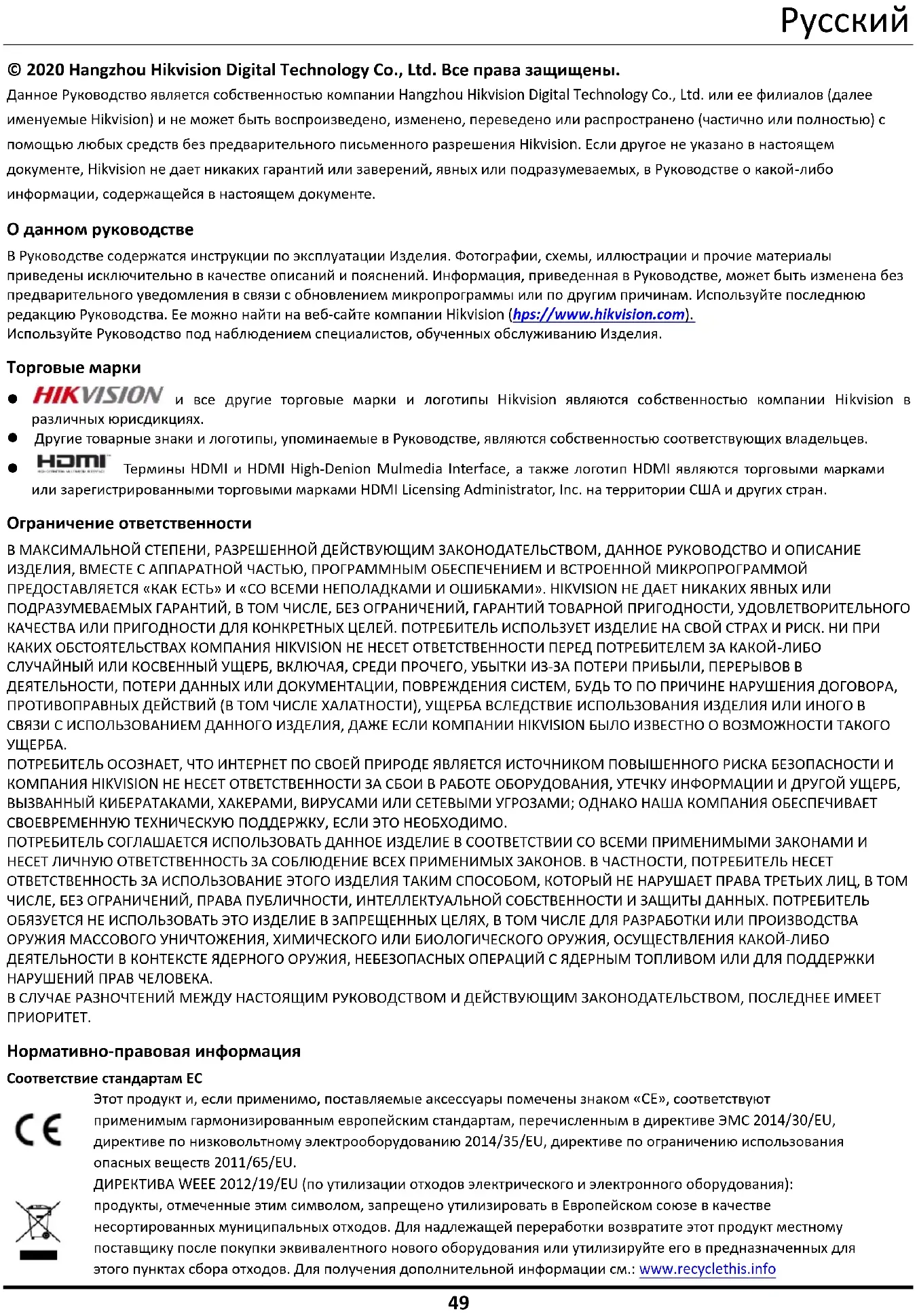 © 2020 Hangzhou Hikvision Digital Technology Co., Ltd. Все права защищены. Данное Руководство является собственностью компании Hangzhou Hikvision Digital Technology Co., Ltd. или ее филиалов (далее именуемые Hikvision) и не может быть воспроизведено, изменено, переведено или распространено (частично или полностью) с помощью любых средств без предварительного письменного разрешения Hikvision. Если другое не указано в настоящем документе, Hikvision не дает никаких гарантий или заверений, явных или подразумеваемых, в Руководстве о какой-либо информации, содержащейся в настоящем документе. О данном руководстве В Руководстве содержатся инструкции по эксплуатации Изделия. Фотографии, схемы, иллюстрации и прочие материалы приведены исключительно в качестве описаний и пояснений. Информация, приведенная в Руководстве, может быть изменена без предварительного уведомления в связи с обновлением микропрограммы или по другим причинам. Используйте последнюю редакцию Руководства. Ее можно найти на веб-сайте компании Hikvision (https://www.hikvision.com). Используйте Руководство под наблюдением специалистов, обученных обслуживанию Изделия. Торговые марки и все другие торговые марки и логотипы Hikvision являются собственностью компании Hikvision в различных юрисдикциях. Другие товарные знаки и логотипы, упоминаемые в Руководстве, являются собственностью соответствующих владельцев. Термины HDMI и HDMI High-Definition Multimedia Interface, а также логотип HDMI являются торговыми марками или зарегистрированными торговыми марками HDMI Licensing Administrator, Inc. на территории США и других стран. Ограничение ответственности В МАКСИМАЛЬНОЙ СТЕПЕНИ, РАЗРЕШЕННОЙ ДЕЙСТВУЮЩИМ ЗАКОНОДАТЕЛЬСТВОМ, ДАННОЕ РУКОВОДСТВО И ОПИСАНИЕ ИЗДЕЛИЯ, ВМЕСТЕ С АППАРАТНОЙ ЧАСТЬЮ, ПРОГРАММНЫМ ОБЕСПЕЧЕНИЕМ И ВСТРОЕННОЙ МИКРОПРОГРАММОЙ ПРЕДОСТАВЛЯЕТСЯ «КАК ЕСТЬ» И «СО ВСЕМИ НЕПОЛАДКАМИ И ОШИБКАМИ». HIKVISION НЕ ДАЕТ НИКАКИХ ЯВНЫХ ИЛИ ПОДРАЗУМЕВАЕМЫХ ГАРАНТИЙ, В ТОМ ЧИСЛЕ, БЕЗ ОГРАНИЧЕНИЙ, ГАРАНТИЙ ТОВАРНОЙ ПРИГОДНОСТИ, УДОВЛЕТВОРИТЕЛЬНОГО КАЧЕСТВА ИЛИ ПРИГОДНОСТИ ДЛЯ КОНКРЕТНЫХ ЦЕЛЕЙ. ПОТРЕБИТЕЛЬ ИСПОЛЬЗУЕТ ИЗДЕЛИЕ НА СВОЙ СТРАХ И РИСК. НИ ПРИ КАКИХ ОБСТОЯТЕЛЬСТВАХ КОМПАНИЯ HIKVISION НЕ НЕСЕТ ОТВЕТСТВЕННОСТИ ПЕРЕД ПОТРЕБИТЕЛЕМ ЗА КАКОЙ-ЛИБО СЛУЧАЙНЫЙ ИЛИ КОСВЕННЫЙ УЩЕРБ, ВКЛЮЧАЯ, СРЕДИ ПРОЧЕГО, УБЫТКИ ИЗ-ЗА ПОТЕРИ ПРИБЫЛИ, ПЕРЕРЫВОВ В ДЕЯТЕЛЬНОСТИ, ПОТЕРИ ДАННЫХ ИЛИ ДОКУМЕНТАЦИИ, ПОВРЕЖДЕНИЯ СИСТЕМ, БУДЬ ТО ПО ПРИЧИНЕ НАРУШЕНИЯ ДОГОВОРА, ПРОТИВОПРАВНЫХ ДЕЙСТВИЙ (В ТОМ ЧИСЛЕ ХАЛАТНОСТИ), УЩЕРБА ВСЛЕДСТВИЕ ИСПОЛЬЗОВАНИЯ ИЗДЕЛИЯ ИЛИ ИНОГО В СВЯЗИ С ИСПОЛЬЗОВАНИЕМ ДАННОГО ИЗДЕЛИЯ, ДАЖЕ ЕСЛИ КОМПАНИИ HIKVISION БЫЛО ИЗВЕСТНО О ВОЗМОЖНОСТИ ТАКОГО УЩЕРБА. ПОТРЕБИТЕЛЬ ОСОЗНАЕТ, ЧТО ИНТЕРНЕТ ПО СВОЕЙ ПРИРОДЕ ЯВЛЯЕТСЯ ИСТОЧНИКОМ ПОВЫШЕННОГО РИСКА БЕЗОПАСНОСТИ И КОМПАНИЯ HIKVISION НЕ НЕСЕТ ОТВЕТСТВЕННОСТИ ЗА СБОИ В РАБОТЕ ОБОРУДОВАНИЯ, УТЕЧКУ ИНФОРМАЦИИ И ДРУГОЙ УЩЕРБ, ВЫЗВАННЫЙ КИБЕРАТАКАМИ, ХАКЕРАМИ, ВИРУСАМИ ИЛИ СЕТЕВЫМИ УГРОЗАМИ; ОДНАКО НАША КОМПАНИЯ ОБЕСПЕЧИВАЕТ СВОЕВРЕМЕННУЮ ТЕХНИЧЕСКУЮ ПОДДЕРЖКУ, ЕСЛИ ЭТО НЕОБХОДИМО. ПОТРЕБИТЕЛЬ СОГЛАШАЕТСЯ ИСПОЛЬЗОВАТЬ ДАННОЕ ИЗДЕЛИЕ В СООТВЕТСТВИИ СО ВСЕМИ ПРИМЕНИМЫМИ ЗАКОНАМИ И НЕСЕТ ЛИЧНУЮ ОТВЕТСТВЕННОСТЬ ЗА СОБЛЮДЕНИЕ ВСЕХ ПРИМЕНИМЫХ ЗАКОНОВ. В ЧАСТНОСТИ, ПОТРЕБИТЕЛЬ НЕСЕТ ОТВЕТСТВЕННОСТЬ ЗА ИСПОЛЬЗОВАНИЕ ЭТОГО ИЗДЕЛИЯ ТАКИМ СПОСОБОМ, КОТОРЫЙ НЕ НАРУШАЕТ ПРАВА ТРЕТЬИХ ЛИЦ, В ТОМ ЧИСЛЕ, БЕЗ ОГРАНИЧЕНИЙ, ПРАВА ПУБЛИЧНОСТИ, ИНТЕЛЛЕКТУАЛЬНО