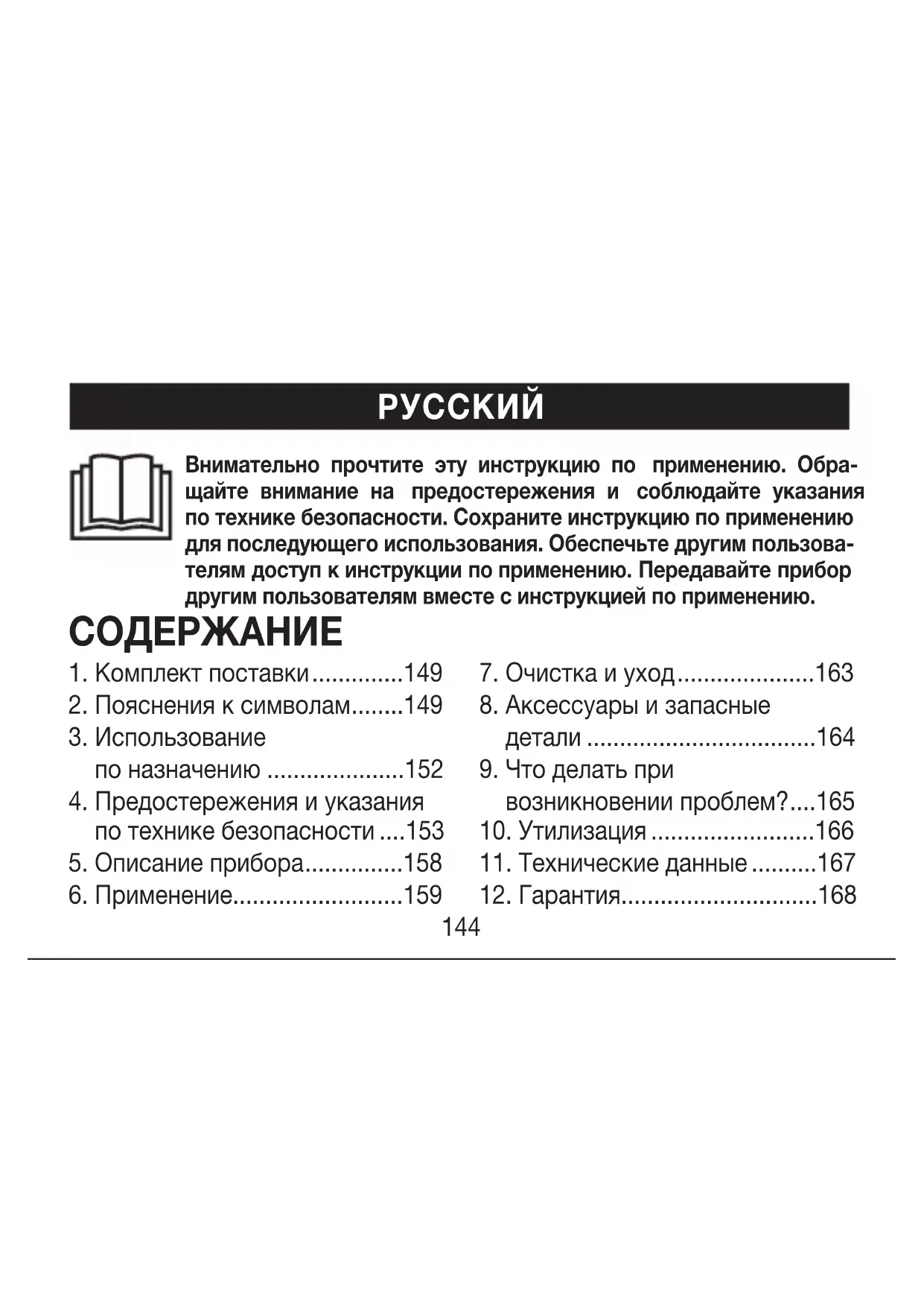 Перед хранением опорожните иочистите при- бор. Очищайте прибор перед каждым следую- щим использованием.149