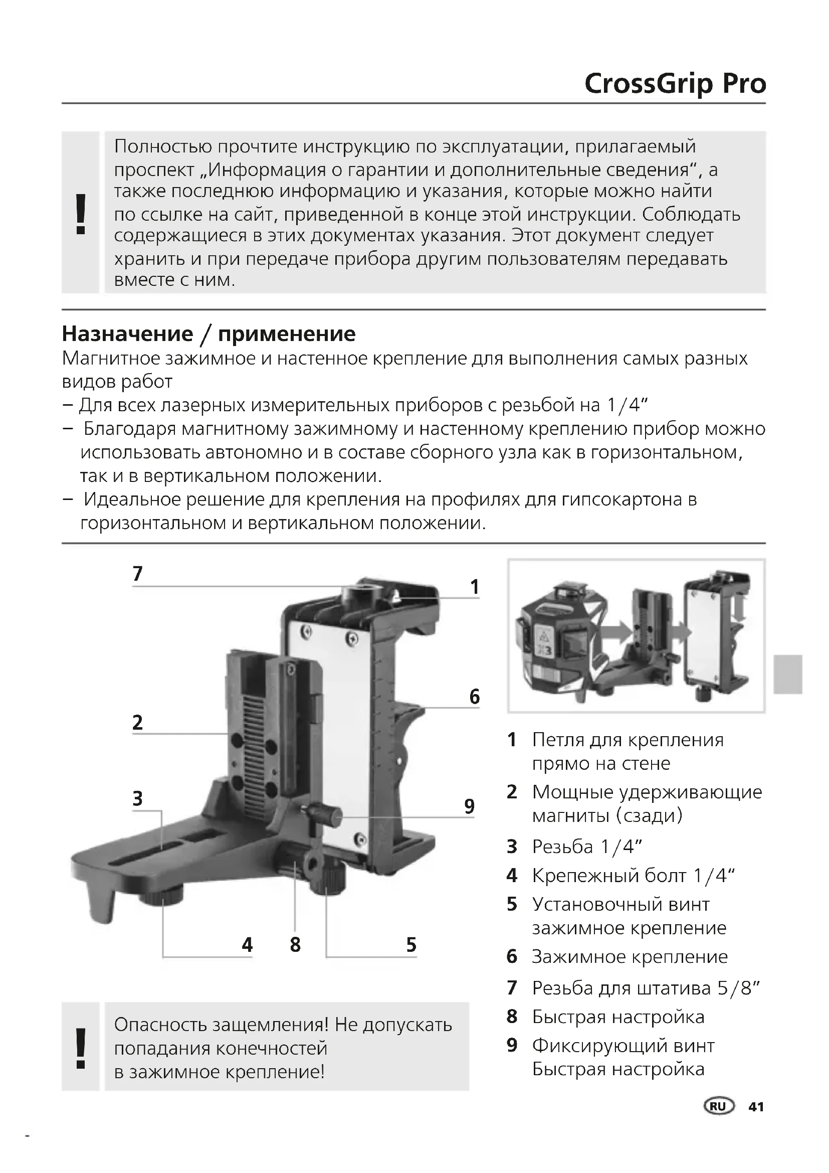 Назначение / применение Магнитное зажимное и настенное крепление для выполнения самых разных видов работ – Для всех лазерных измерительных приборов с резьбой на 1/4“ – Благодаря магнитному зажимному и настенному креплению прибор можно использовать автономно и в составе сборного узла как в горизонтальном, так и в вертикальном положении. – Идеальное решение для крепления на профилях для гипсокартона в горизонтальном и вертикальном положении. Полностью прочтите инструкцию по эксплуатации, прилагаемый проспект „Информация о гарантии и дополнительные сведения“, а также последнюю информацию и указания, которые можно найти по ссылке на сайт, приведенной в конце этой инструкции. Соблюдать содержащиеся в этих документах указания. Этот документ следует хранить и при передаче прибора другим пользователям передавать вместе с ним.
