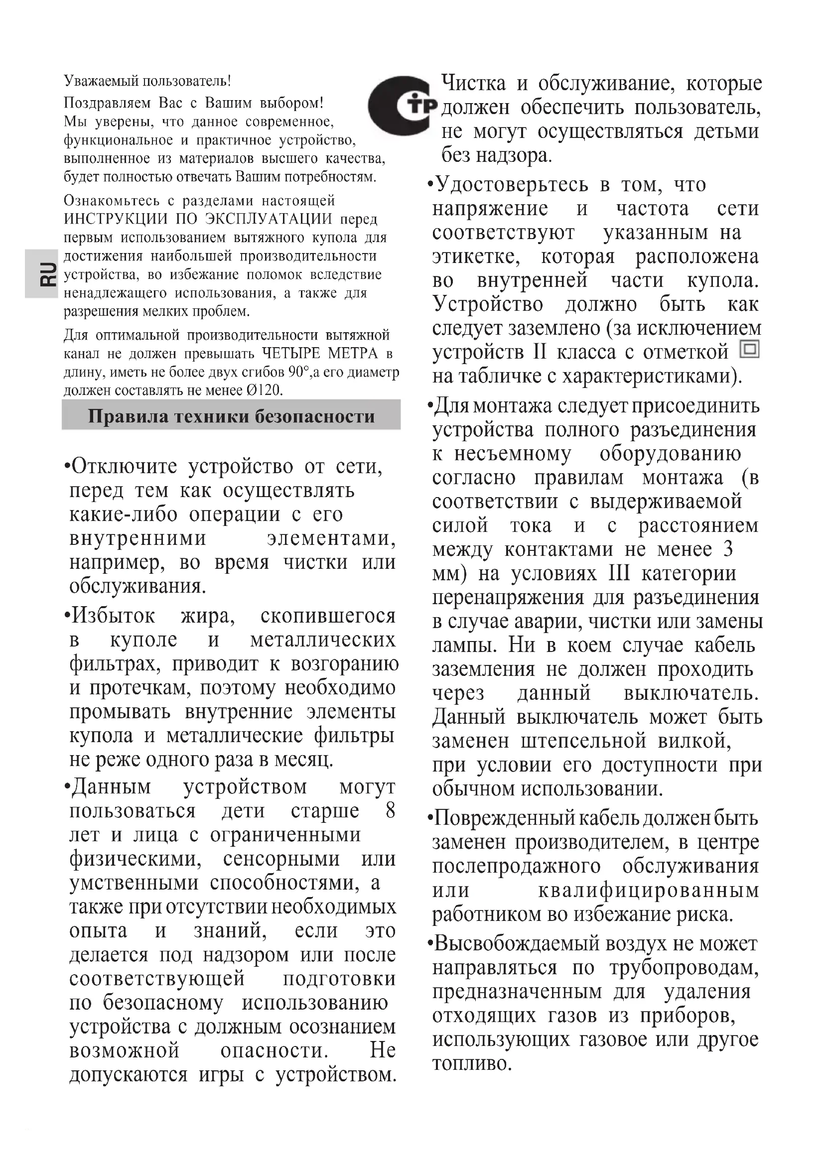 Απομακρύνετε το εμπόδιο από το σωλήνα εξαγωγής, ή αντικαταστήστε με άλλον φαρδύτερο Ø 12 cm ή Ø 15 cm, ή αντικαταστήστε με πτυσσόμενες γρίλιες στην έξοδο. Οι λαμπτήρες δεν ανάβουν. Έχουν καεί. Έχουν ξεβιδωθεί. Αντικαταστήστε τους. Σφίξτε τους.RU Уважаемый пользователь! Поздравляем Вас с Вашим выбором! Мы уверены, что данное современное, функциональное и практичное устройство, выполненное из материалов высшего качества, будет полностью отвечать Вашим потребностям. Ознакомьтесь с разделами настоящей ИНСТРУКЦИИ ПО ЭКСПЛУАТАЦИИ перед первым использованием вытяжного купола для достижения наибольшей производительности устройства, во избежание поломок вследствие ненадлежащего использования, а также для разрешения мелких проблем. Для оптимальной производительности вытяжной канал не должен превышать ЧЕТЫРЕ МЕТРА в длину, иметь не более двух сгибов 90°,а его диаметр должен составлять не менее Ø120.