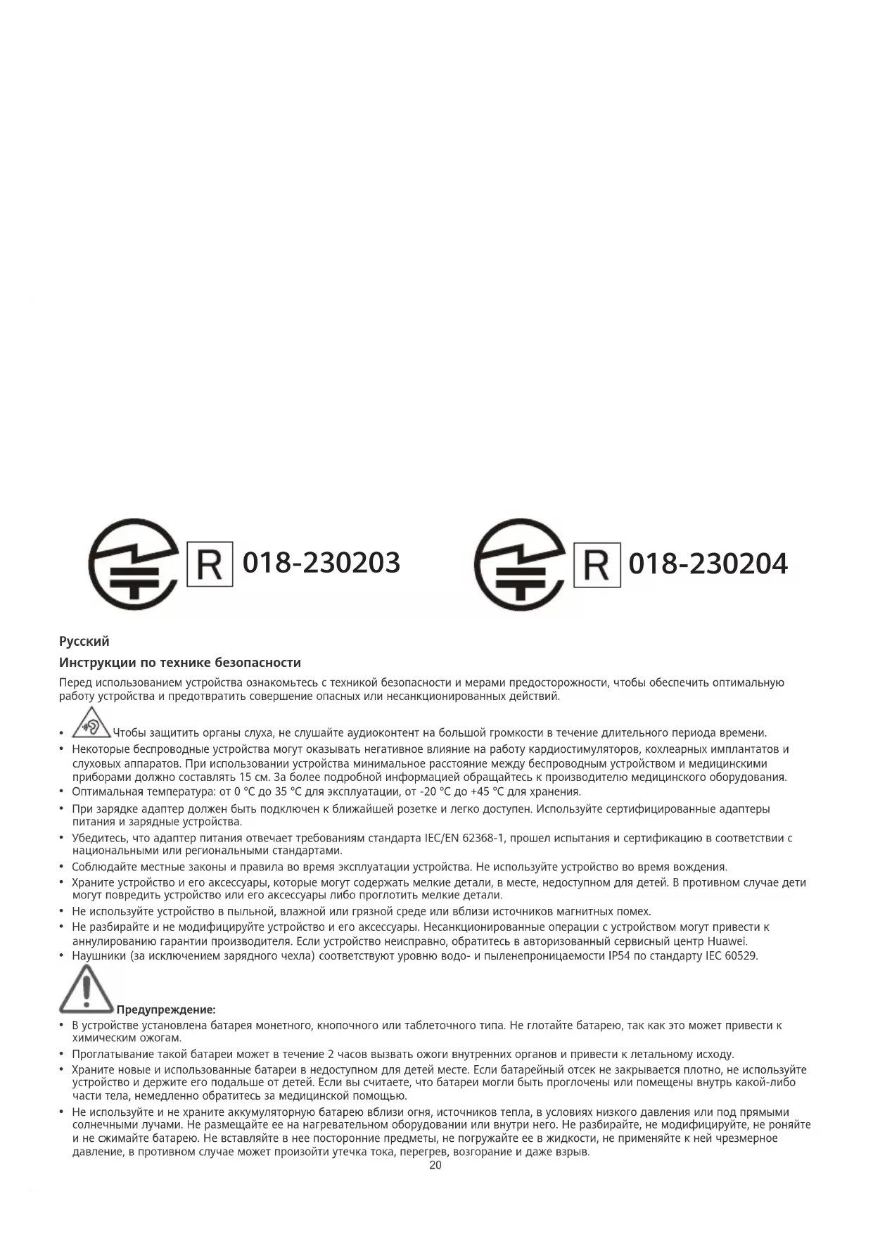 являются зарегистрированными товарными знаками Bluetooth SIG, Inc. и используются компанией Huawei Technologies Co., Ltd. в рамках лицензии. Huawei Device Co., Ltd. — это дочерняя компания Huawei Technologies Co., Ltd. Защита персональных данных Меры, принимаемые компанией для защиты ваших персональных данных, описаны в политике конфиденциальности, с которой можно ознакомиться на веб-сайте https://consumer.huawei.com/privacy-policy или в приложении после установления сопряжения с телефоном. Лицензионное соглашение с пользователем программного обеспечения Перед использованием данного устройства внимательно прочтите лицензионное соглашение с конечным пользователем программного обеспечения. Используя данное устройство, вы принимаете положения указанного лицензионного соглашения. Ознакомиться с соглашением можно на веб-сайте: https://consumer.huawei.com/en/legal/eula/. Открытое программное обеспечение Чтобы посмотреть лицензии открытого ПО, откройте веб-сайт https://consumer.huawei.com/en/opensource/ и введите имя устройства. Беспроводные наушники HUAWEI модель T0018 соответвсуют: ТР ТС 020/2011 «Электромагнитная совместимость технических средств»; ТР ЕАЭС 037/2016 «Об ограничении применения опасных веществ в изделиях электротехники и радиоэлектроники». Зарядный футляр для беспроводных наушников HUAWEI модель T0018C, соответствует: ТР ТС 020/2011 «Электромагнитная совместимость технических средств»; ТР ЕАЭС 037/2016 «Об ограничении применения опасных веществ в изделиях электротехники и радиоэлектроники». Изготовитель Huawei Device Co., Ltd. Хуавэй Девайс Ко., Лтд. КНР, 523808, г. Дунгуань, Гуандун, Административное здание №2. Тел.: +86-755-28780808 Импортер в РФ ООО «Техкомпания Хуавэй», Российская Федерация, 121614, г. Москва, ул. Крылатская, д. 17, корп. 2, ОГРН 1027739023212. Email: CISSupport@huawei.com тел.:+7 (495) 234-0686 Импортер в РК Импортер и организация, уполномоченная принимать претензии от потребителей на территории РК: ТОО «Хуавей Текнолоджиз Казахстан», Адрес: Казахстан, город Алматы, Медеуский район, проспект Достык, дом 210Б, Блок 1, почтовый индекс 050051. Единая служба поддержки Huawei: 6530. Импортер в РБ СООО «Мобильные ТелеСистемы», пр-т Независимости, 95-4, г. Минск, 220012 Республика Беларусь Унитарное предприятие «А1», 220030, Республика Беларусь, г. Минск, ул. Интернациональная, 36-2. ООО «ТрайдексБелПлюс», 223016, Минский район Новодворский с/с 33/1-8 ком.64, район д.Большое Стиклево. 21Назначение Беспроводные наушники HUAWEI модель T0018 — это беспроводные наушники с зарядным чехлом. Наушники оснащены функцией активного шумоподавления, которую можно активировать во время голосовых вызовов или прослушивания музыки. Комплектация Наушники- 1 пара (левый и правый наушник) Зарядный футляр - 1 шт. Амбушюры - 3 пары (доступны в больших, средних и маленьких размерах. Средний размер предварительно установлен на наушниках.) Эксплуатационные документы. *Комплект поставки может отличаться в зависимости от страны или региона реализации.