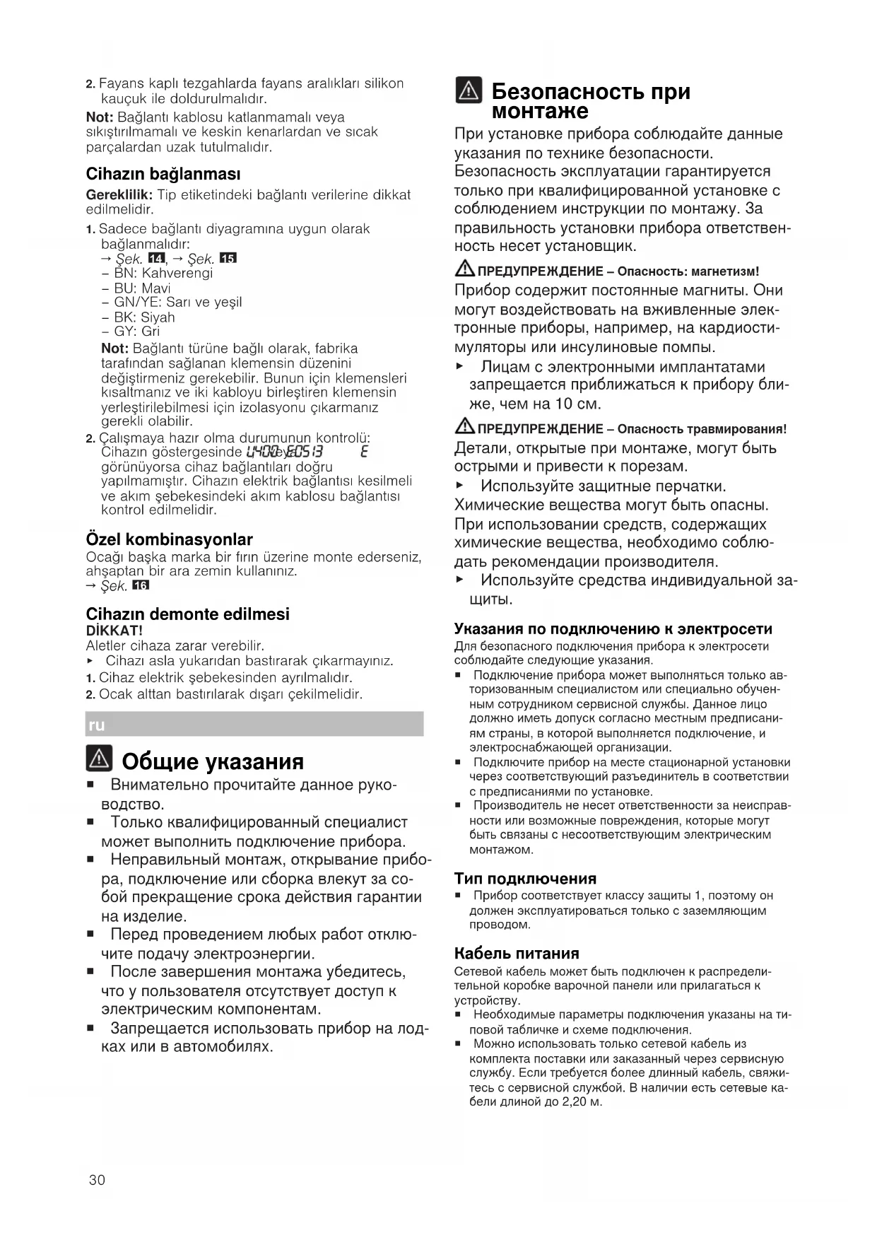 Указания по подключению к электросети Для безопасного подключения прибора к электросетисоблюдайте следующие указания.¡ Подключение прибора может выполняться только ав-торизованным специалистом или специально обучен-ным сотрудником сервисной службы. Данное лицодолжно иметь допуск согласно местным предписани-ям страны, в которой выполняется подключение, иэлектроснабжающей организации.¡ Подключите прибор на месте стационарной установкичерез соответствующий разъединитель в соответствиис предписаниями по установке.¡ Производитель не несет ответственности за неисправ-ности или возможные повреждения, которые могутбыть связаны с несоответствующим электрическиммонтажом. Тип подключения ¡ Прибор соответствует классу защиты 1, поэтому ондолжен эксплуатироваться только с заземляющимпроводом. Кабель питания Сетевой кабель может быть подключен к распредели-тельной коробке варочной панели или прилагаться кустройству.¡ Необходимые параметры подключения указаны на ти-повой табличке и схеме подключения.¡ Можно использовать только сетевой кабель изкомплекта поставки или заказанный через сервиснуюслужбу. Если требуется более длинный кабель, свяжи-тесь с сервисной службой. В наличии есть сетевые ка-бели длиной до 2,20м.31 Указания по мебели для встраивания ¡ Индукционную варочную панель можно устанавливать только над шкафами для подогрева посуды или духо- выми шкафами с вытяжными вентиляторами. Не уста- навливайте под варочную панель холодильники, посу- домоечные машины, невентилируемые духовые шка- фы или посудомоечные машины. ¡ Убедитесь, что мебель для встраивания способна вы- держивать температуру не менее 90°C.