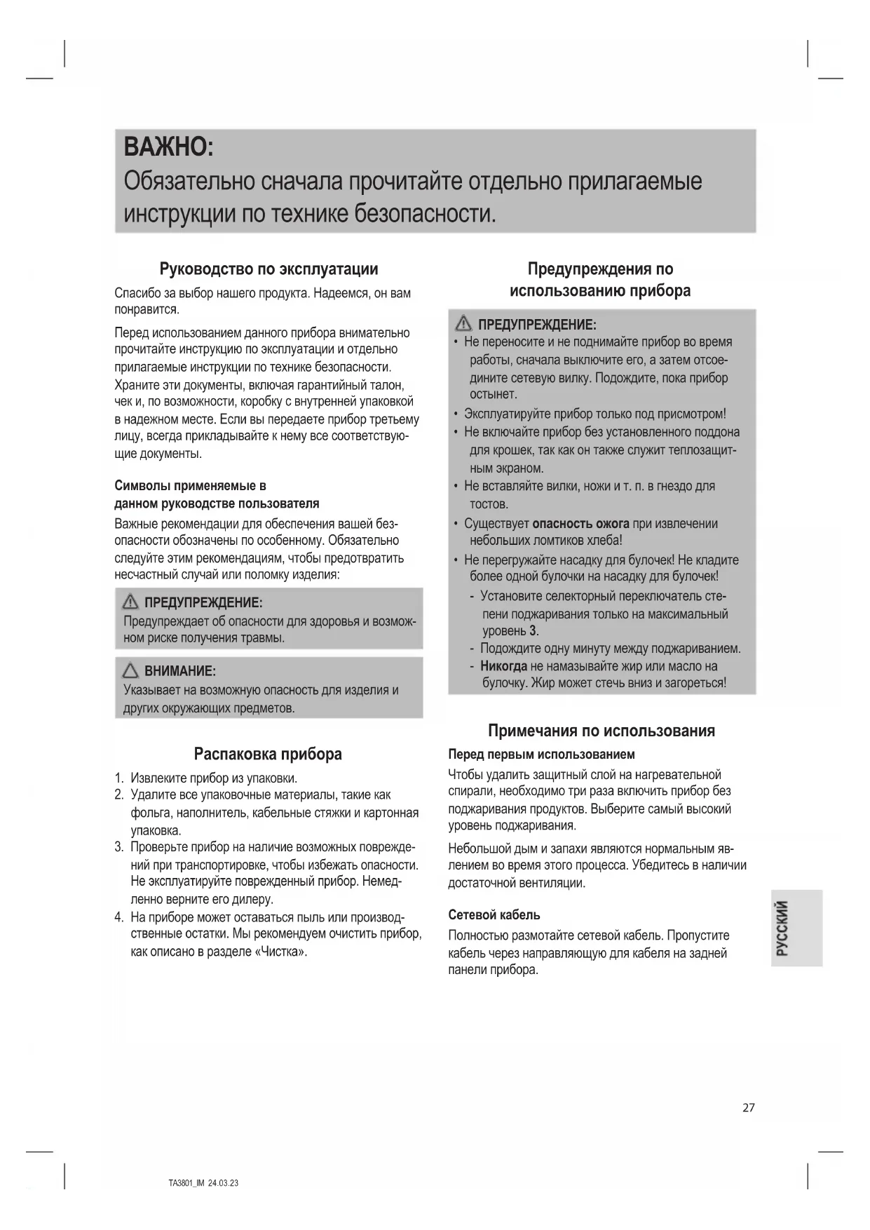 - Не перегружайте насадку для булочек! Не кладите более одной булочки на насадку для булочек! - Установите селекторный переключатель сте- пени поджаривания только на максимальный уровень 3. - Подождите одну минуту между поджариванием. - Никогда не намазывайте жир или масло на булочку. Жир может стечь вниз и загореться! Примечания по использования Перед первым использованием Чтобы удалить защитный слой на нагревательной спирали, необходимо три раза включить прибор без поджаривания продуктов. Выберите самый высокий уровень поджаривания. Небольшой дым и запахи являются нормальным яв- лением во время этого процесса. Убедитесь в наличии достаточной вентиляции. Сетевой кабель Полностью размотайте сетевой кабель. Пропустите кабель через направляющую для кабеля на задней панели прибора.TA3801_IM 24.03.23